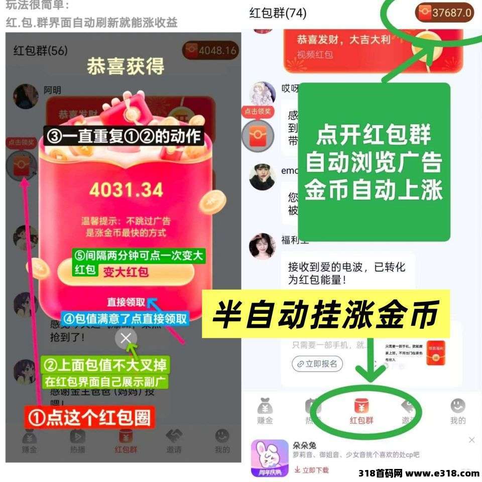 可半自动挂机自动刷广告,打开软件,停留在红包群,就能自动刷广,金币和红包自动上涨,