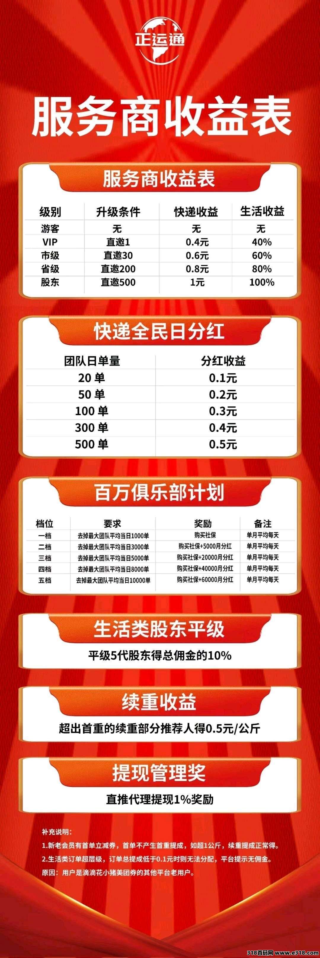 免费代理!我推广正运通的原因很简单:人人能做不分人群只需要推广分享就能坐享收益,市场足够大,不受任何影响波动,长期稳定!**裂变分佣,实现管道收益,万人团队帮你赚钱,假设团队十万人,只要有快递或打车等生活订单,你就有佣金,日入几百百上干。对接团队长及散人一起赚钱微信扫码收藏使用或添加到桌面使用。进入主页,上方关注平台公众号可进入自己的代理提现后台