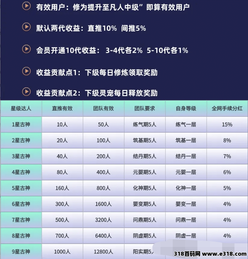 默认手续费20%,直推1人有效降低1%,最低降至10%。直推10%间推5%奖励,开通会员享10代团队奖励,升级星级达人成为1-9星古神享手续费**奖励。