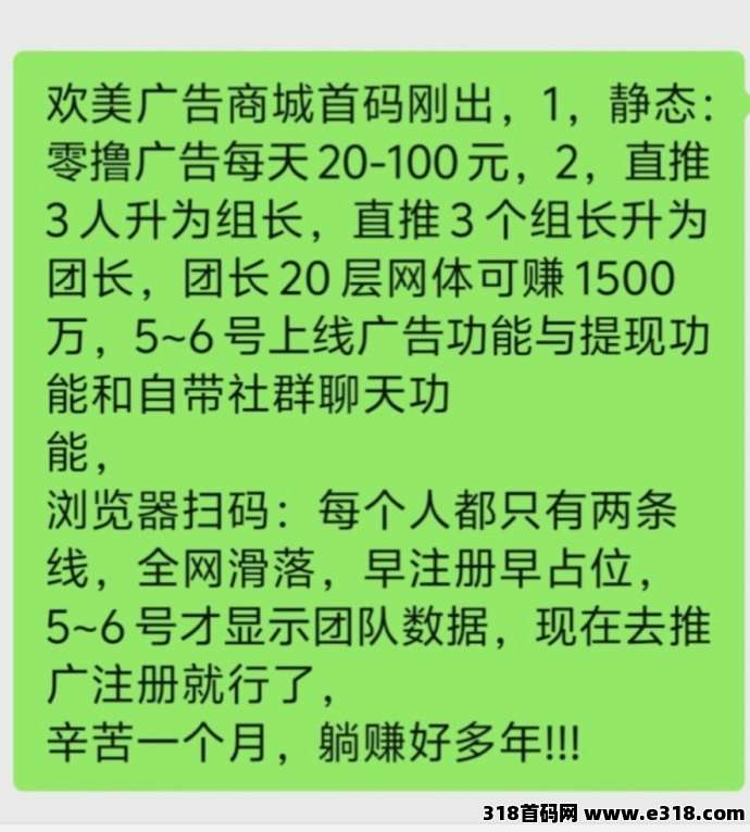 1,零撸广告每天20—100米,2,直推3人升为组长,直推3个组长升为团长,团长20层网体可zhuan1500万,自带类似V信社裙聊天功能,复制lian接到浏览气或浏览气扫玛