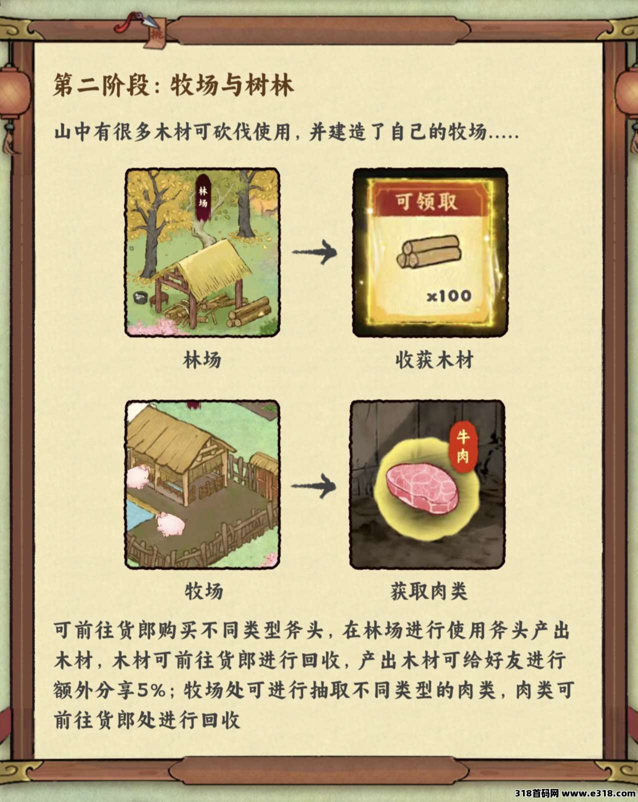 ②玩家可以购买不同类型斧头,在林场产出木材资源,木材也可以自己用或者进行回收,在牧场中玩家可以抽取各种肉类,也可以回收或者自己用。