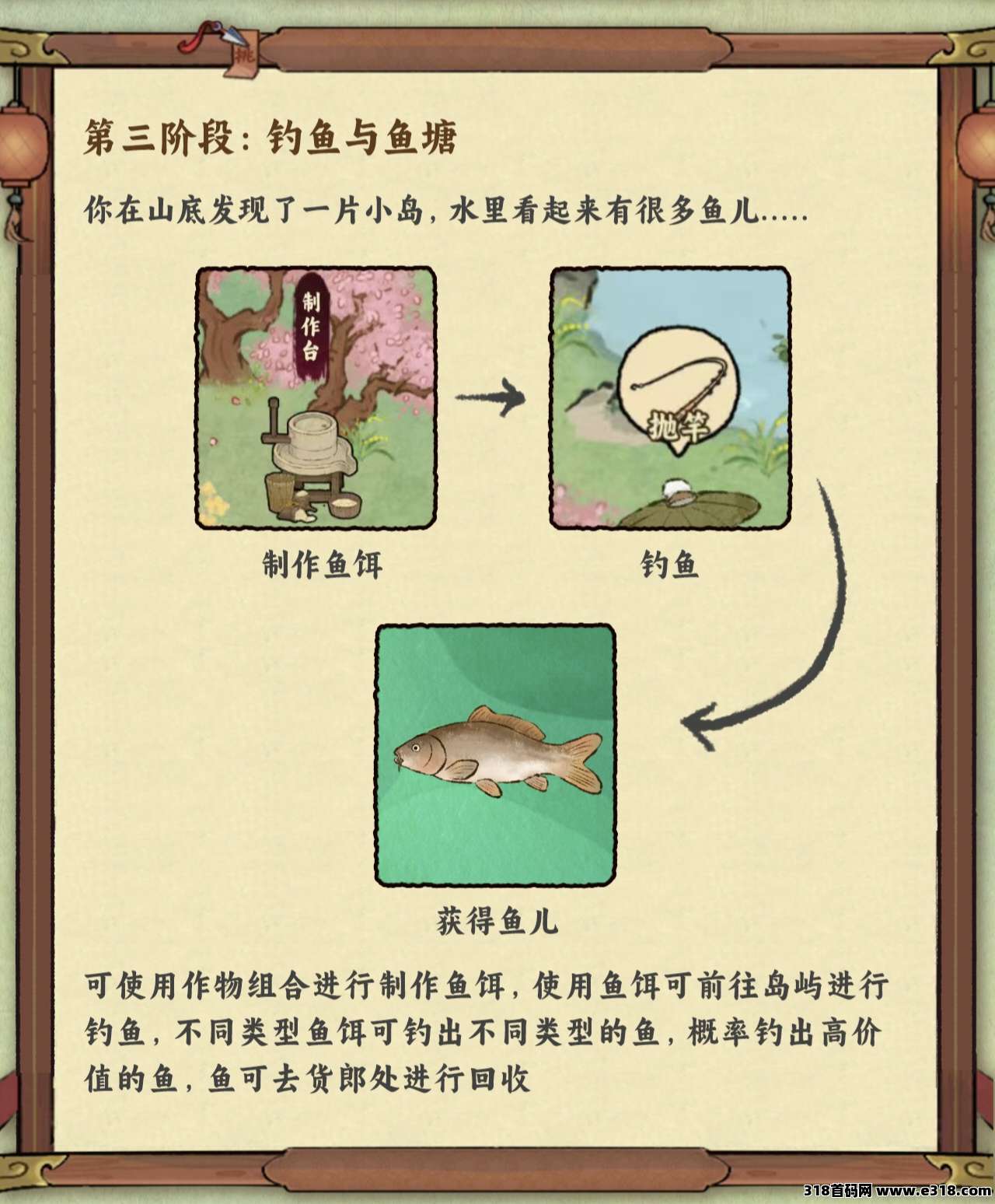 ③玩家可以使用农作物和肉类等制作鱼饵,拥有鱼饵后入岛屿钓鱼,根据不同类型鱼饵能够钓到不同品质的鱼,同样鱼可以回收也可以留着自己用。