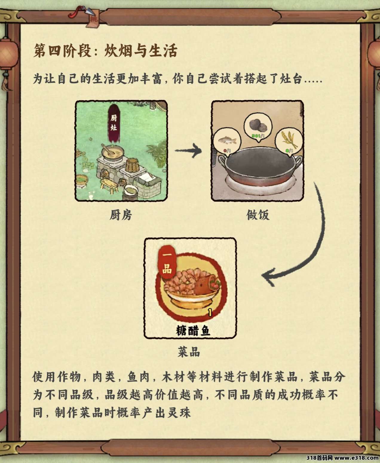 ④拥有大批量资源材料后,玩家可以在厨房使用木材、鱼类、肉类、农作物制作菜品,分为不同的等级和品质,在炒菜过程中有概率产出“灵珠”