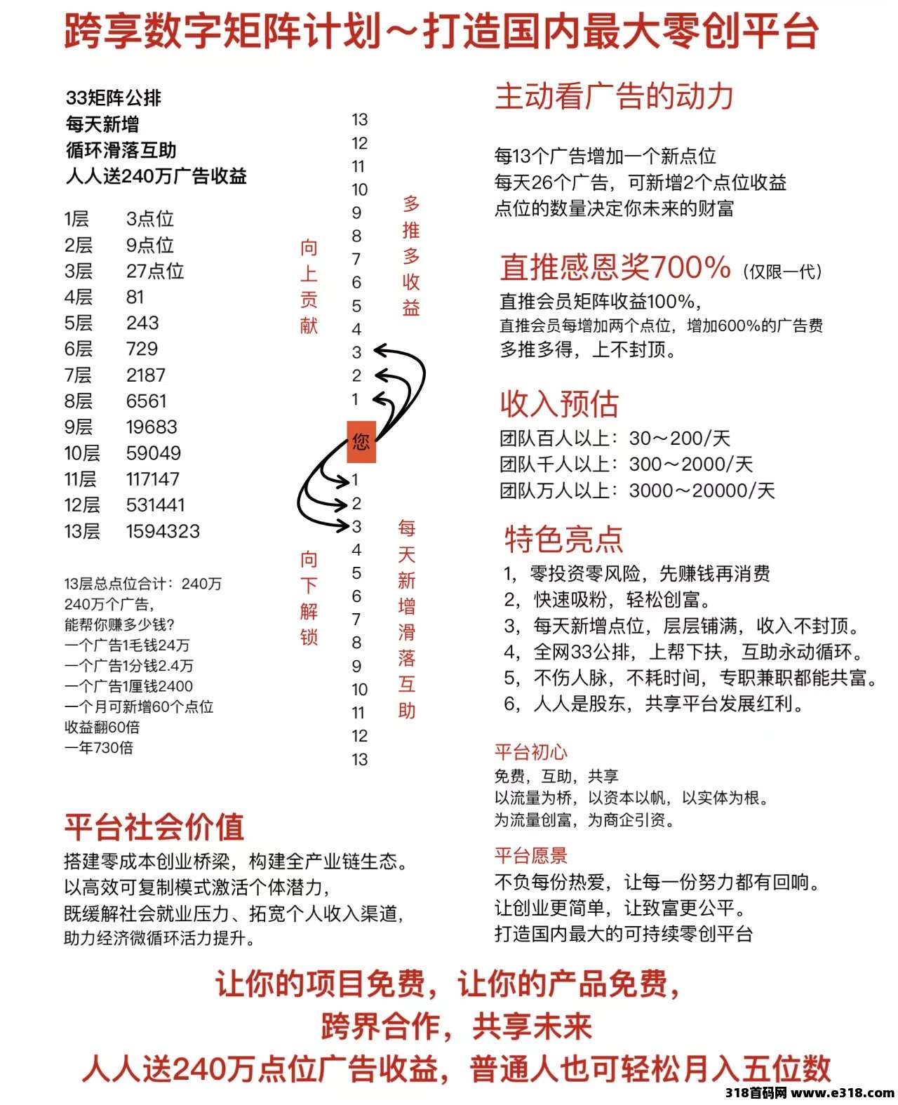 每看13个广告送一个矩阵点位,每一个矩阵点位可排队收到240万个广告收益。