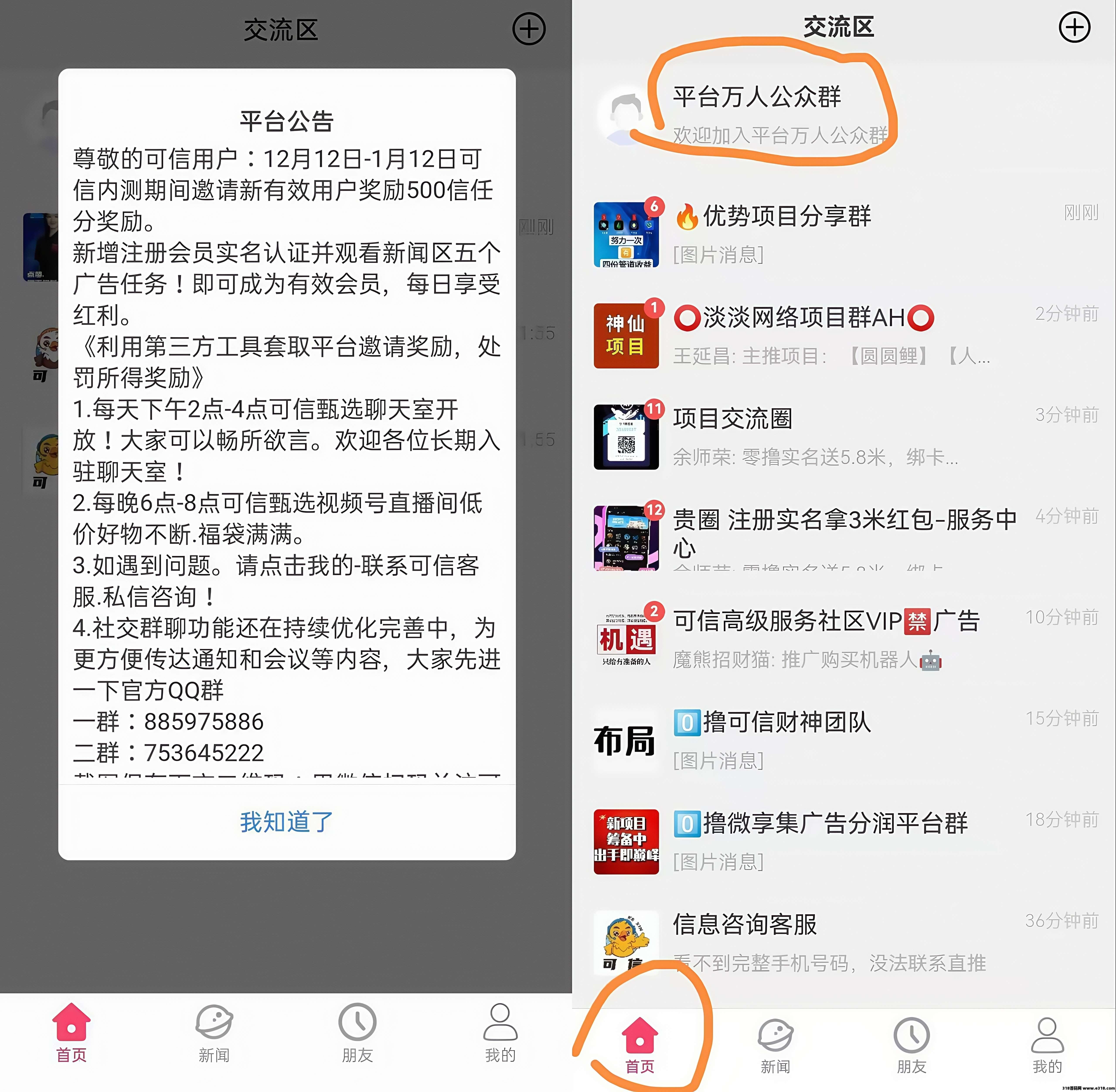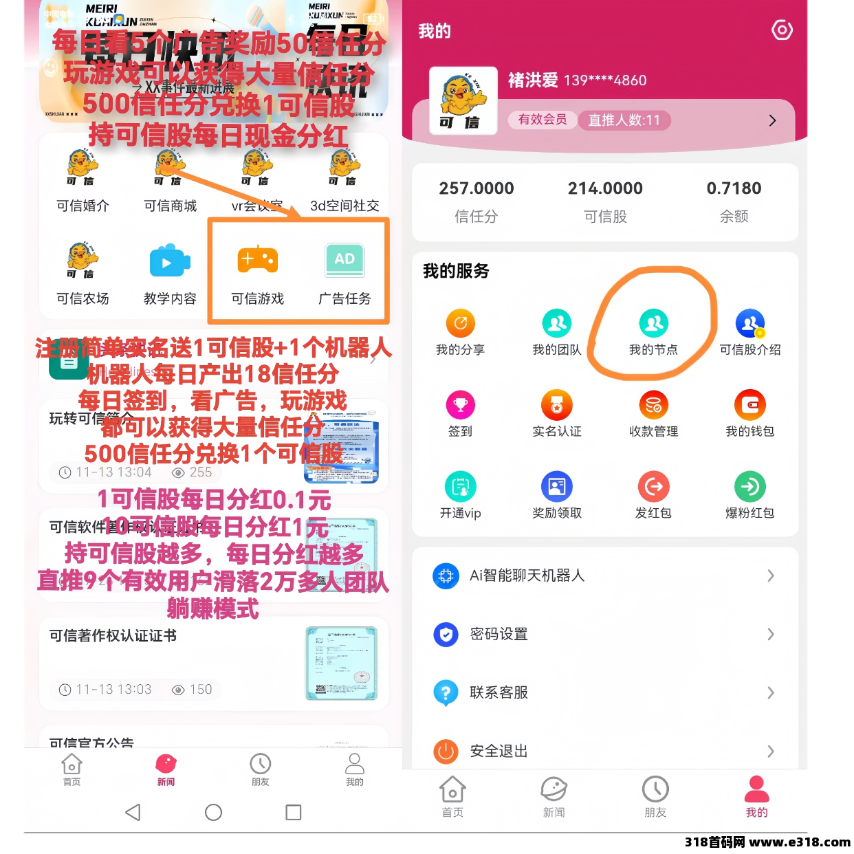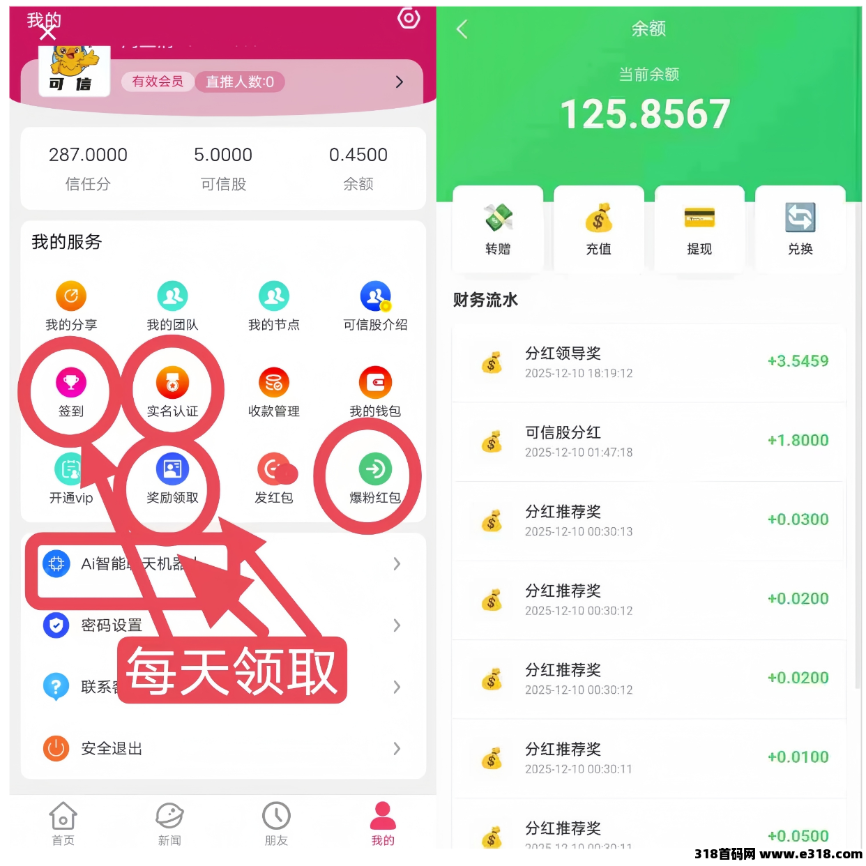 ②:兑换比例(500信任分兑换1可信股),1可信股每天现金分虹0.1元!