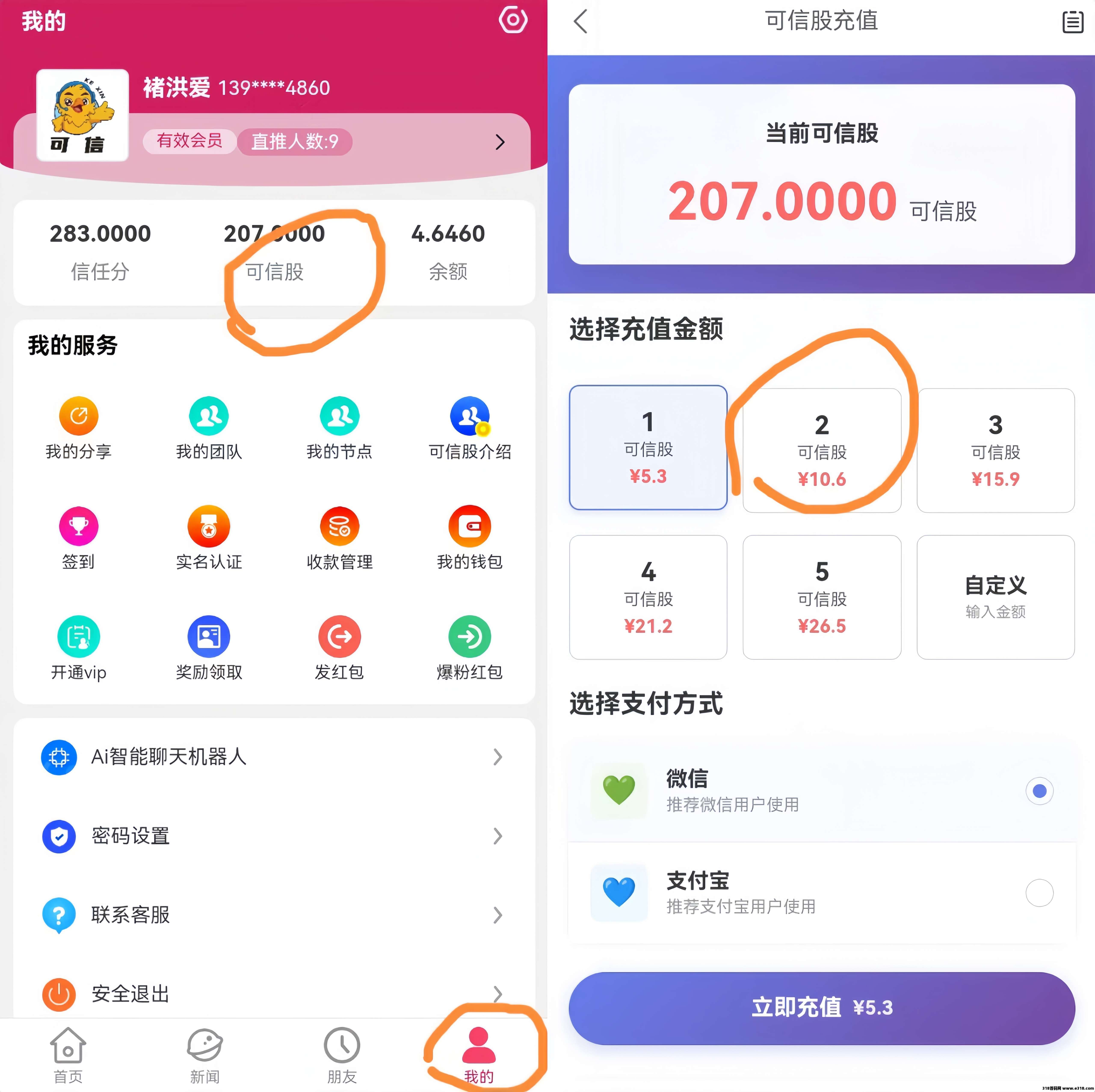 实铭以后充入2股可信股,就能拥有3股可信股,即可成为有效会员,参与每天分虹!