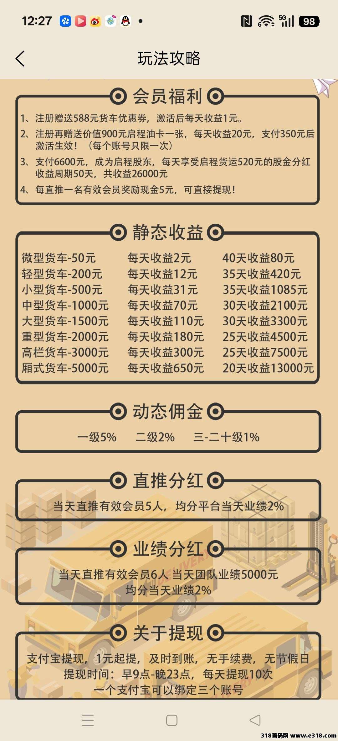 启程货运,卦机零撸保底收益高,注册奖励588,激活后每天收益1米,团队模式,邀请日入百米,
