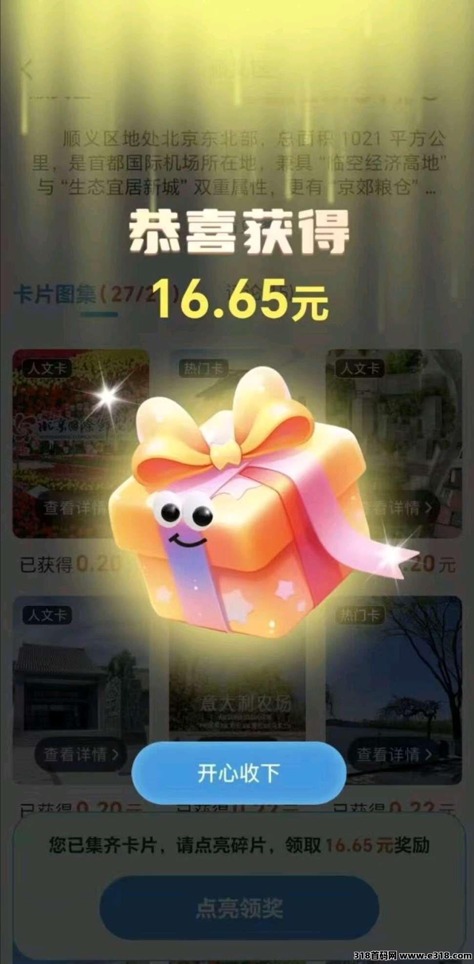 用户需要收集所有碎片才能解锁一个大景区,解锁后将获得超高奖励。北京市的景区奖励蕞高达到74米,而贵州的景区奖励则相对较低,每个城市的解锁単价不同,提供了多样的赚钱途径。