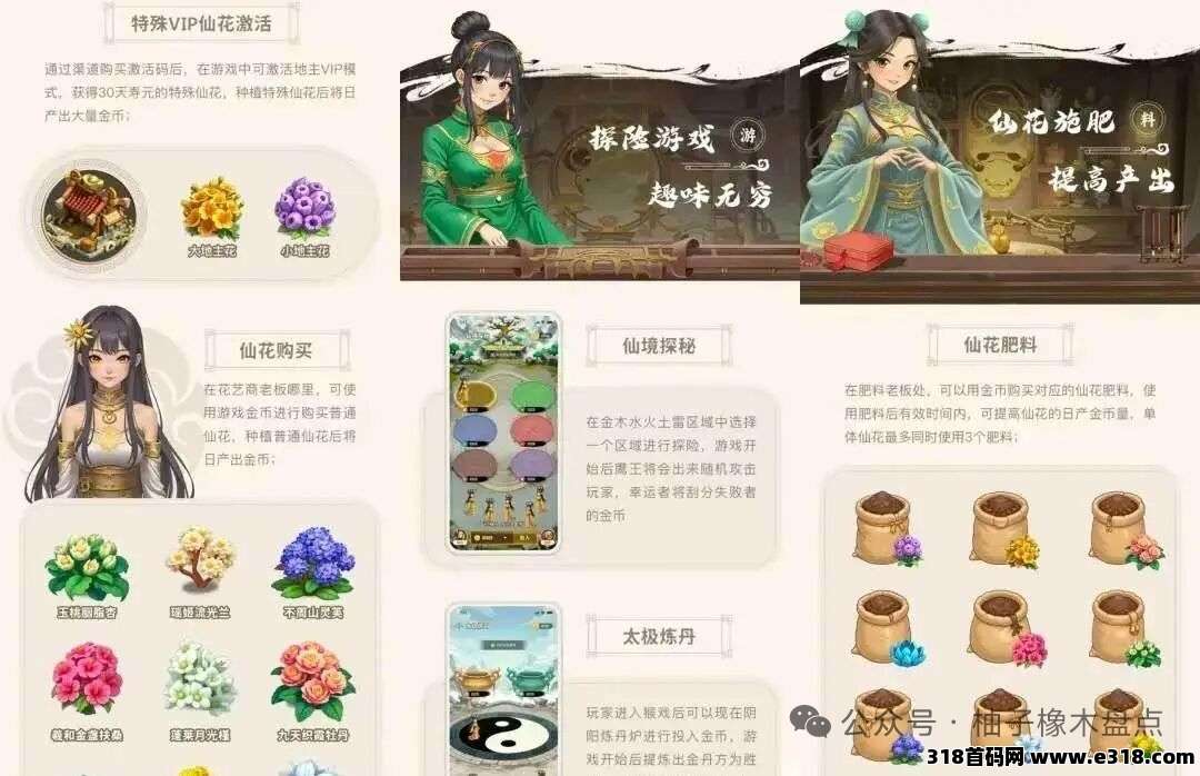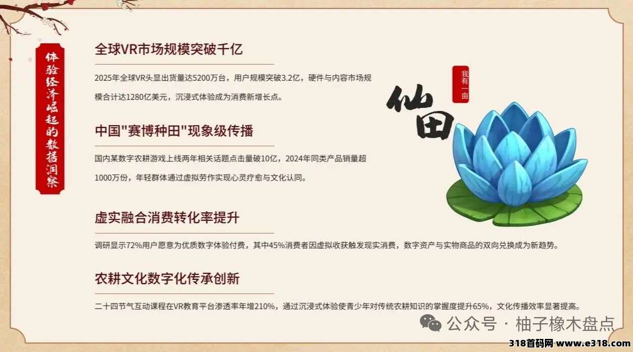 模式:游戏+购物+VR+修仙种田+卷轴上线时间:✅ 公测:1月18日项目介绍: 《我有一亩仙田》预计1月18日左右上线,首发588米和1000米卡,在种子商店购买种子种植,购买道具装备药水等,如时间加速、自动施肥、自动浇水、超级施肥、快速收获等道具,收获作物后出售获得金币