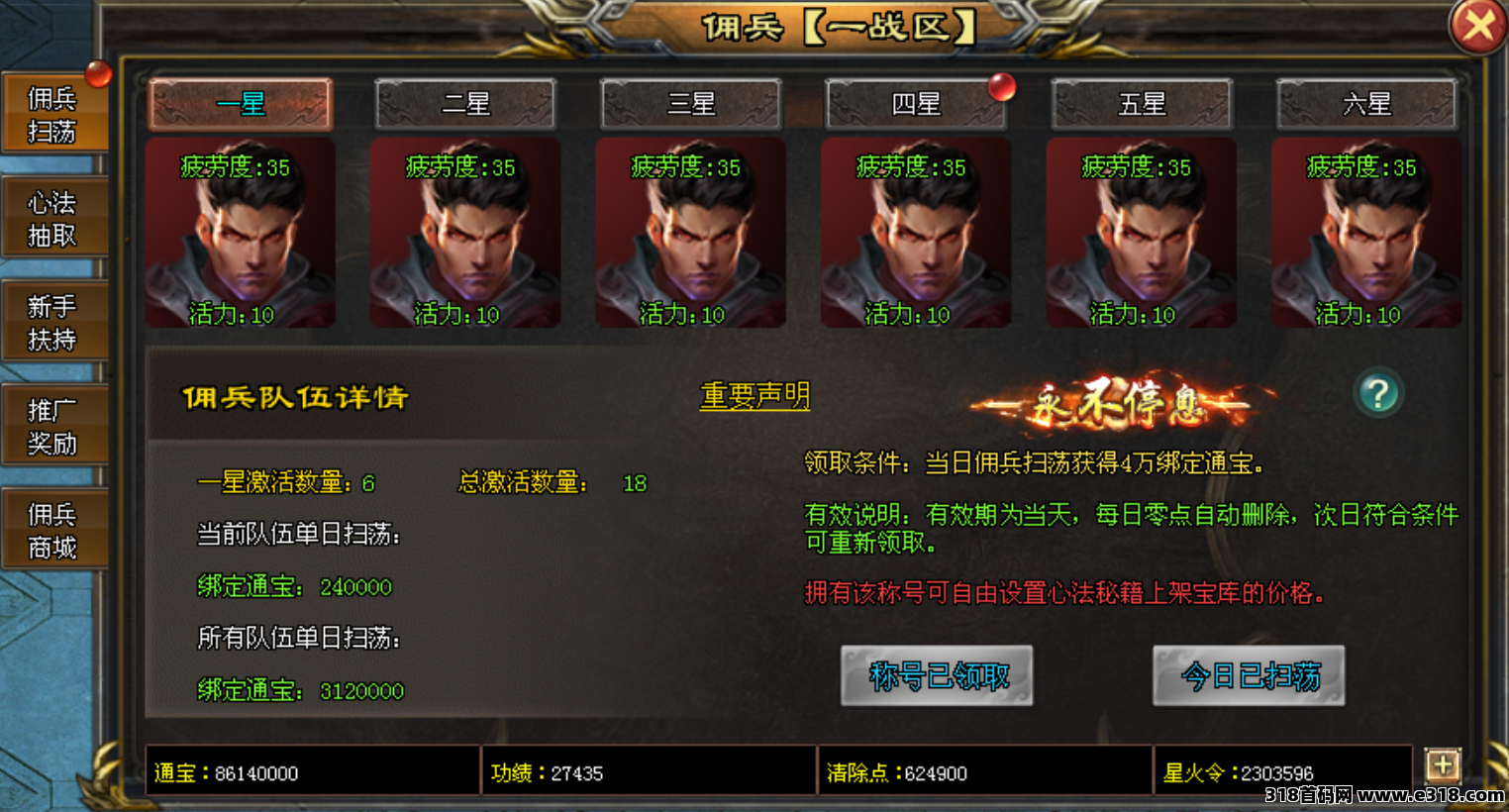 只需要激活佣兵,每天一键扫荡即可获得通宝