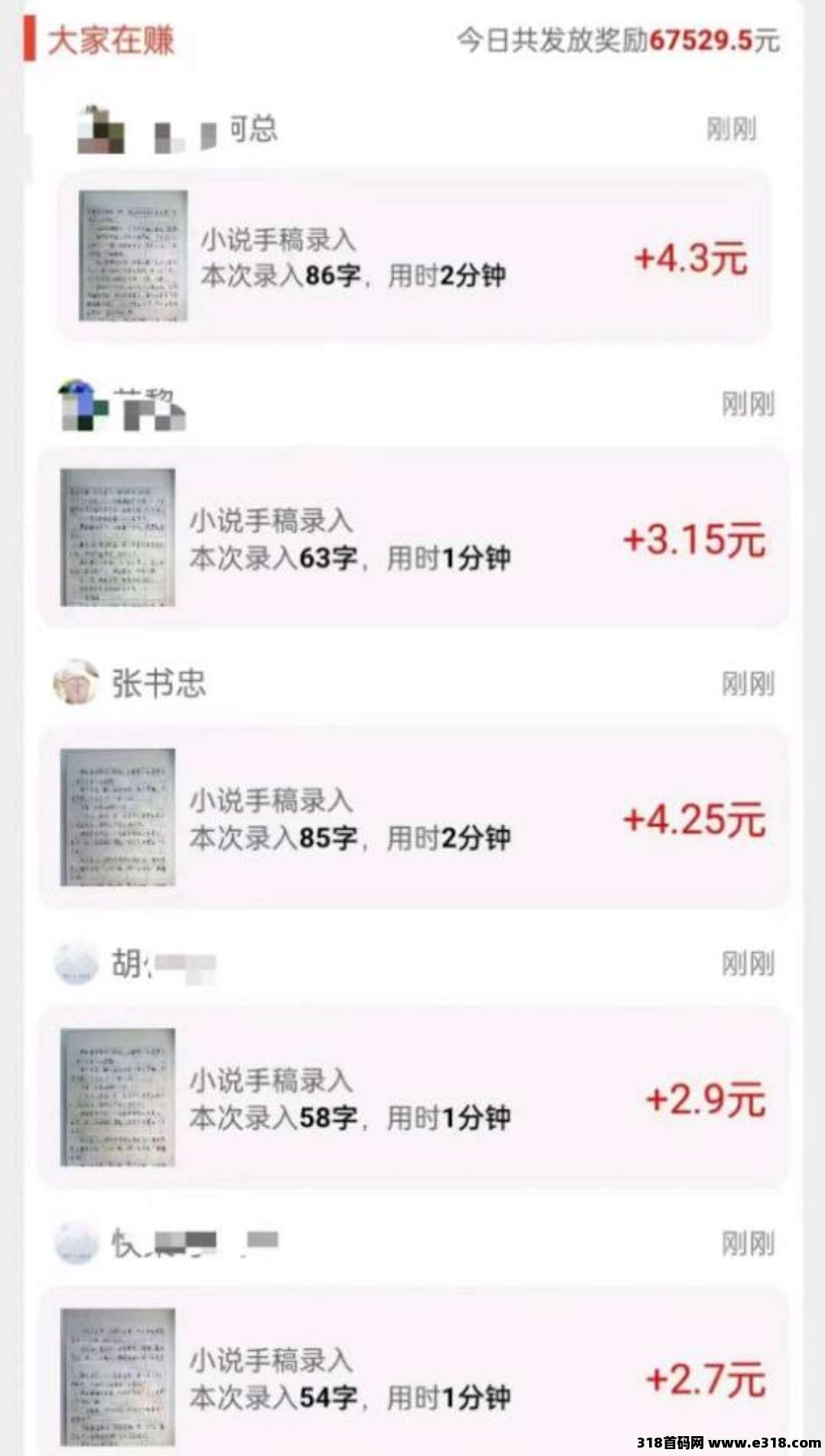 手稿打字录入项目一天50+,原理就是把小说手稿整理成电子版的,有很多小说手稿作者会在里面投放任务,按照小说文字(照片)打字录入平台即可,每个任务明码标价,审核速度快,满10元即可提现