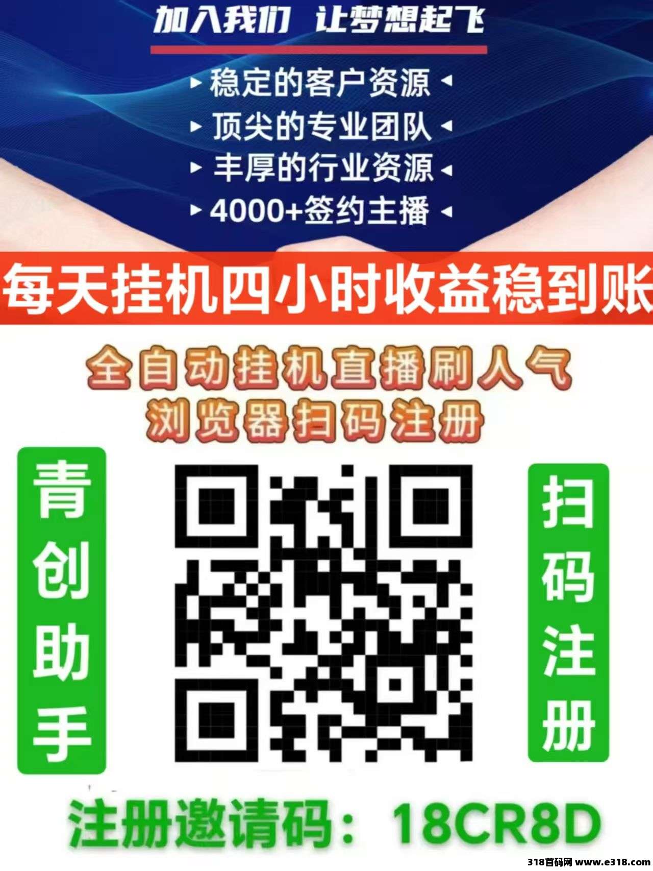青创直播绿色挂载,支持安卓,苹果,电脑三端,每天挂4个小时,投入收益回报比1比1,提线门槛10米。不氪金!浏览器扫码注册下载 ,邀请码 18CR8D