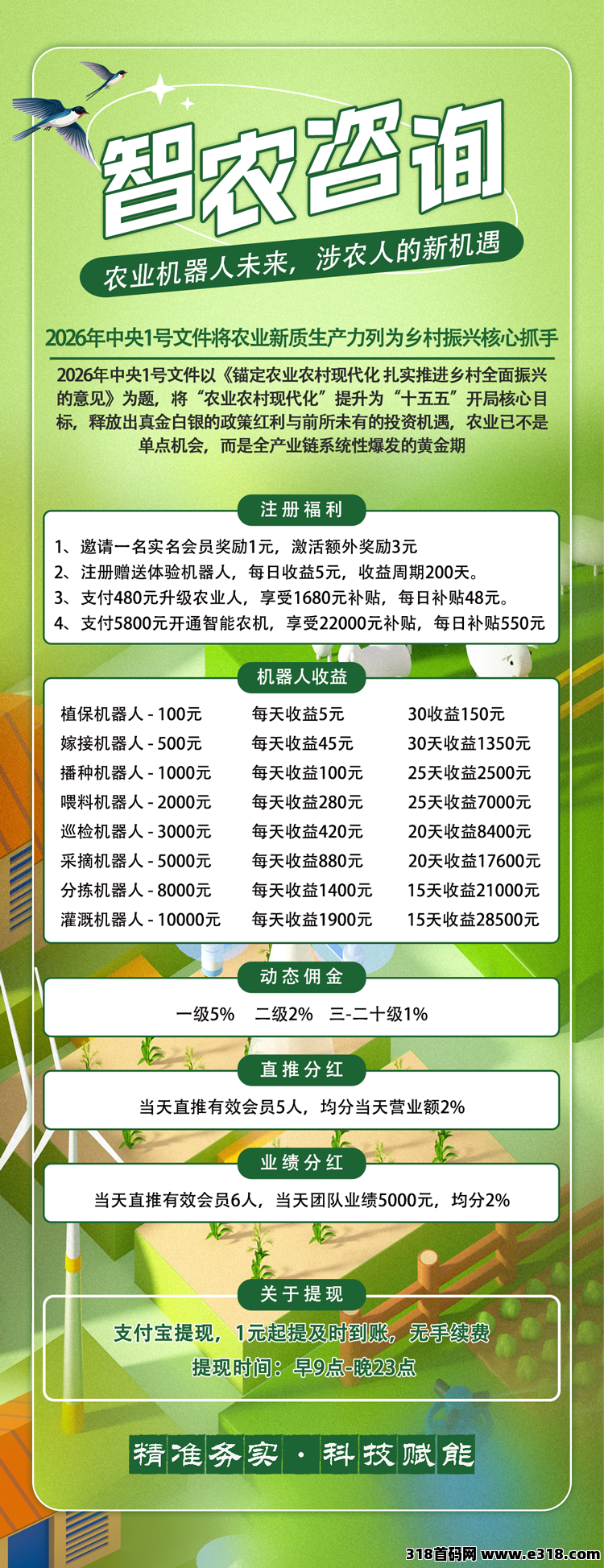 ❤️首码【智农咨询】刚出一秒注册就送机器人每天自动收益5米,推广一人注册1米+有效3米,1米起提秒到,速度推❗️