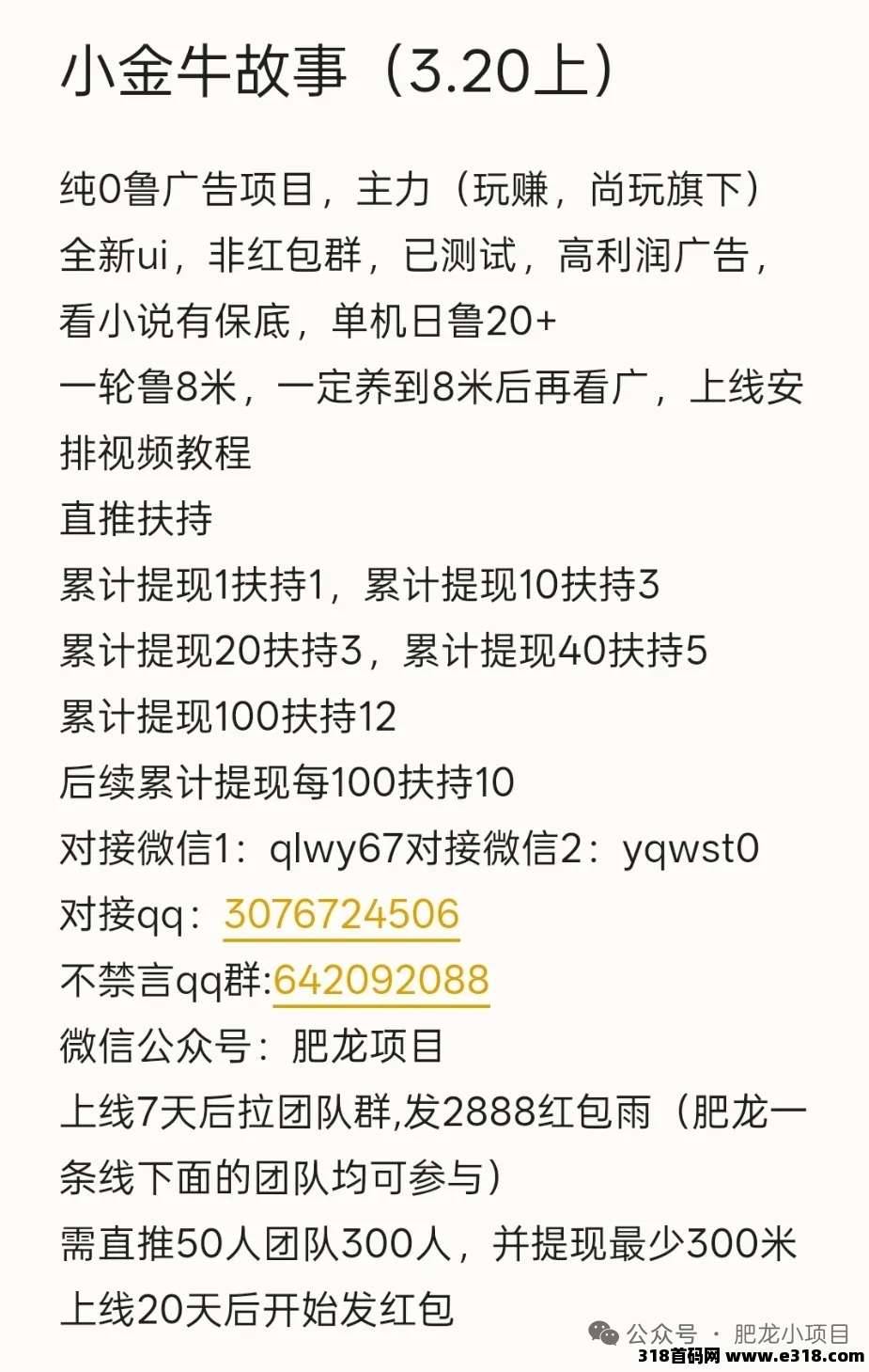 小金牛故事,上线时间已定3.20号,此项目为尚玩旗下主力产品,已测试单机20+,8米顶包,每天3轮即24米,提现秒到账,此前小金牛短剧已2年,收益依然稳定,吊打市面上广告项目如图