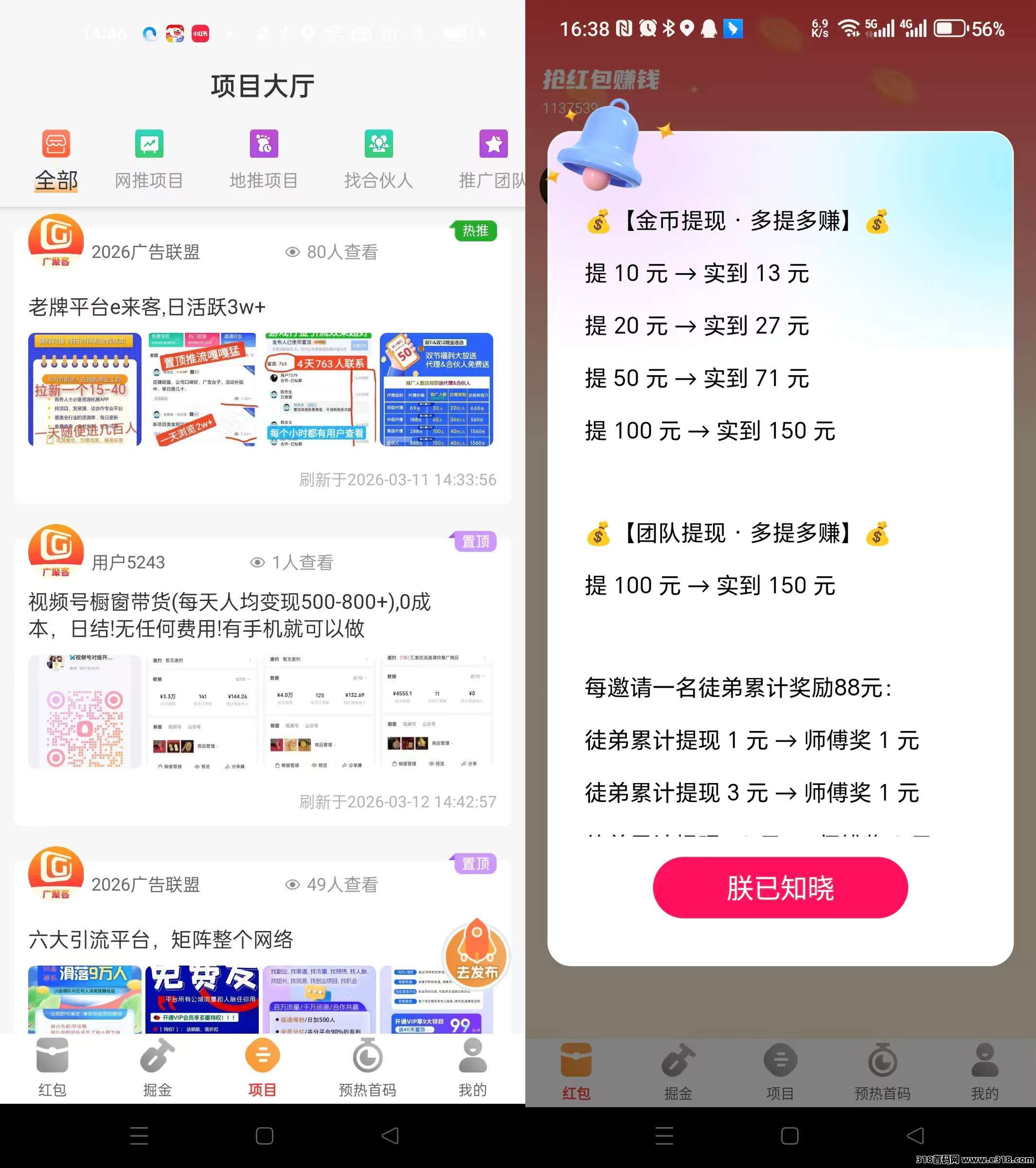 广聚客首码,零撸广告赚,保底收$益高不养机,放水中,可开团,拉新奖励,邀请当天收$益百米,新品上线,