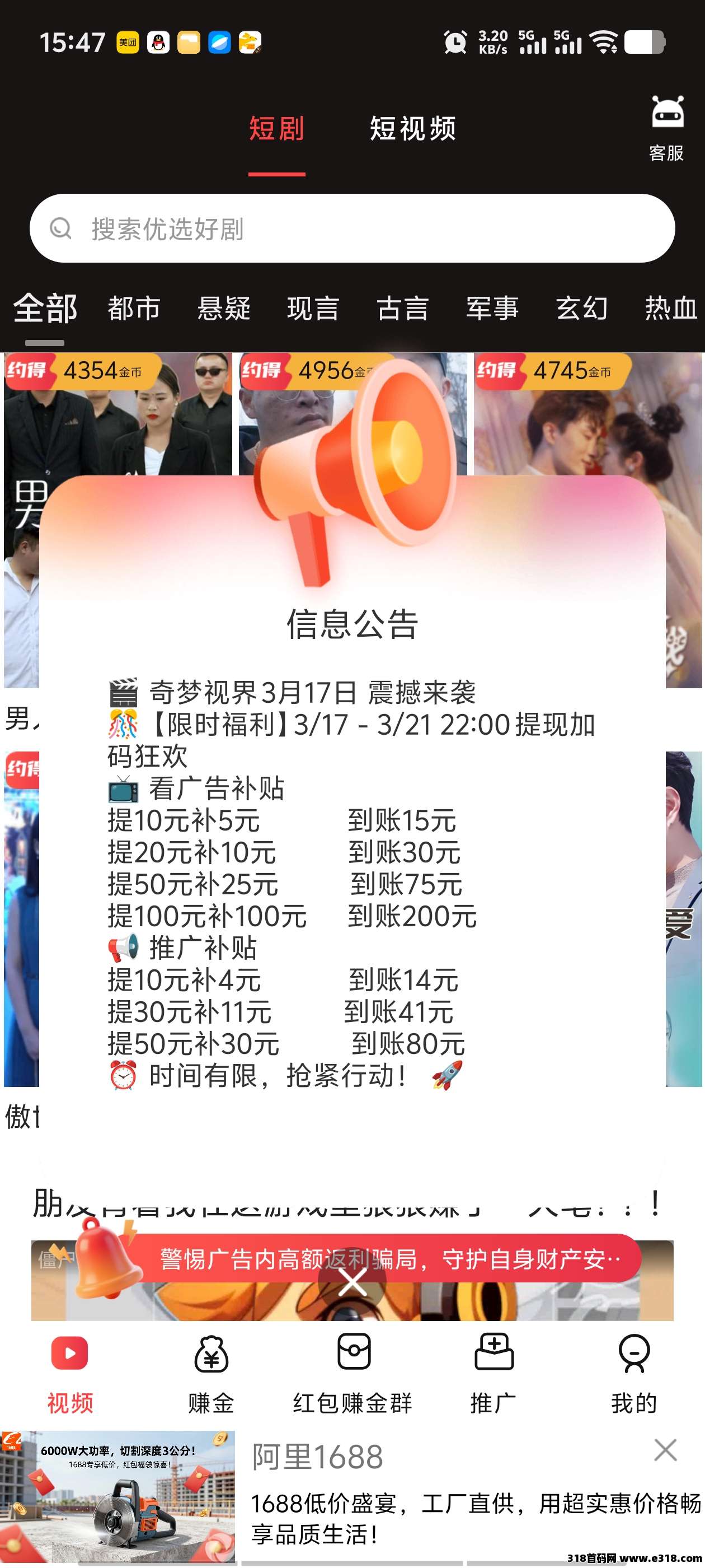 全新台子,可0撸广告赚米!这可是大公司,非常靠谱。全程零撸,你随时随地想赚就赚,提现还能秒到账!这是个纯零撸、纯看广告的APP,每天有80个广告,看广告收益在0.1 - 1之间,相当可观,1米起提!单号保底润8米一天
