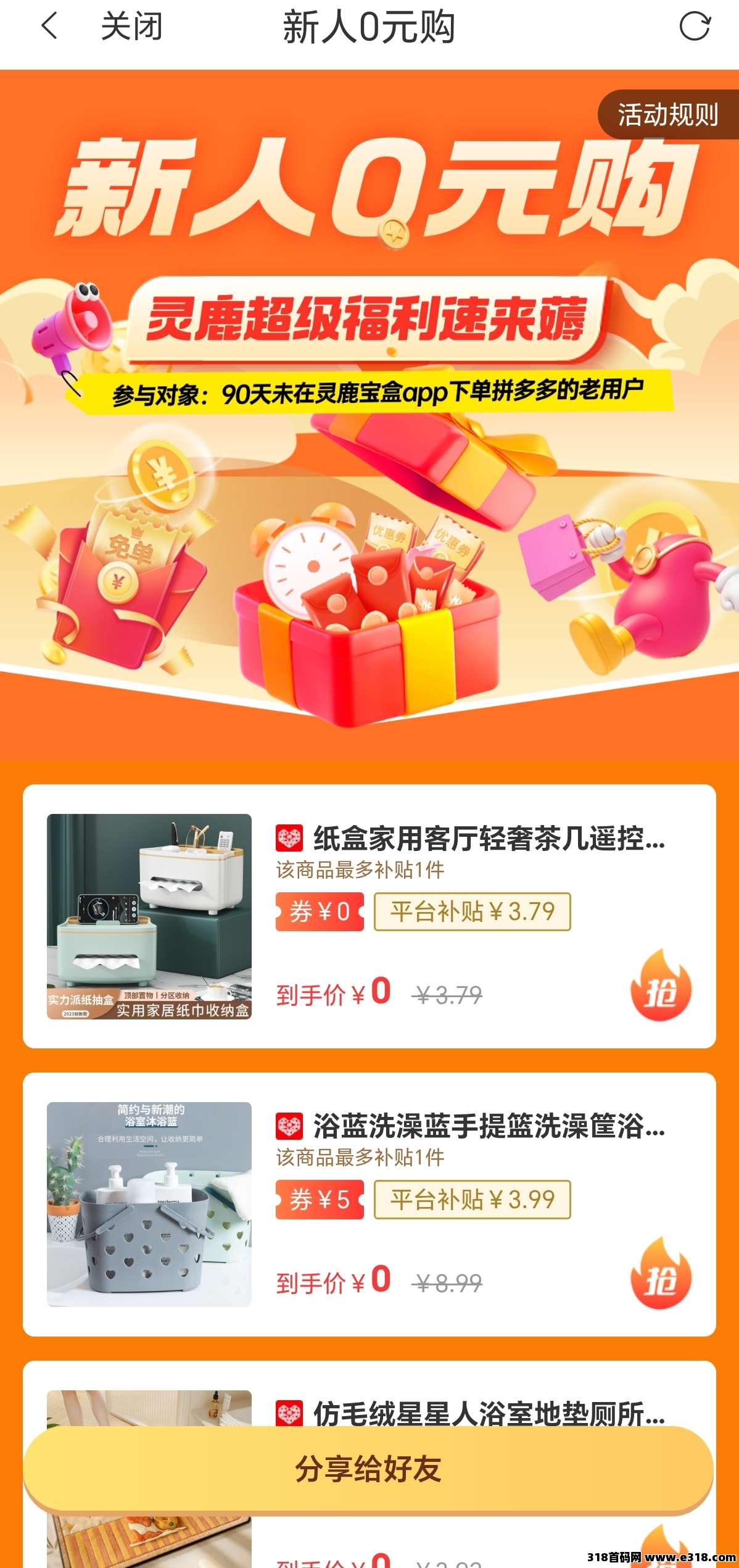 下载完app后,打开登录,到首页,点击“新人0元购”免费薅一款商品!!!