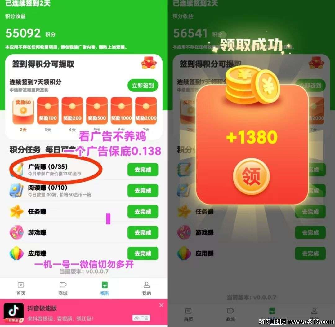 一个广告保底0.14,每天33个,不养鸡,1元起提