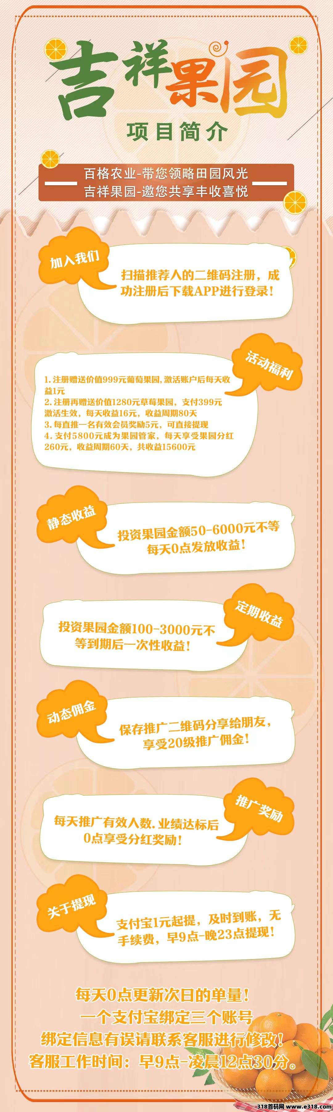 首码预热内排吉祥果园3月23号上线送999元,全新模式每天0点收益,每天可提现收益,本金自由到期可退!注册激活有扶持