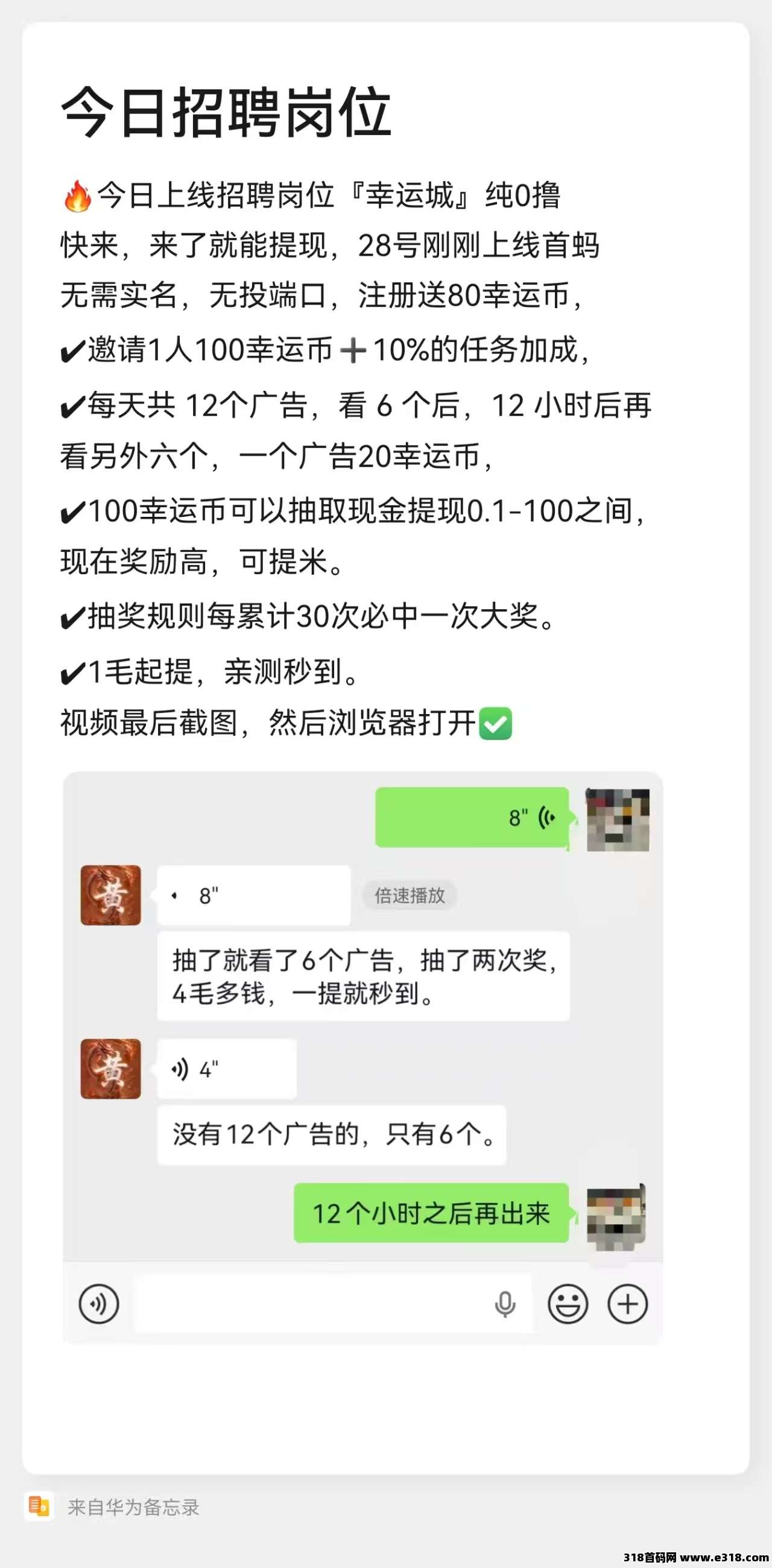 每天12个广告,看一个给一个,一个广告20幸运币,