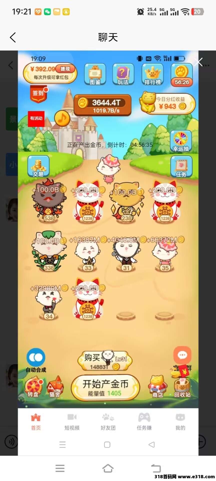 在核心玩法上,项目以猫咪合成为核心,每完成一次同级猫咪合成升级,都能直接领取红包奖励,猫咪等级越高,产的金币也就越多,并且在猫咪合成38级以后,直接获取永久招财猫,解锁长期**资格。