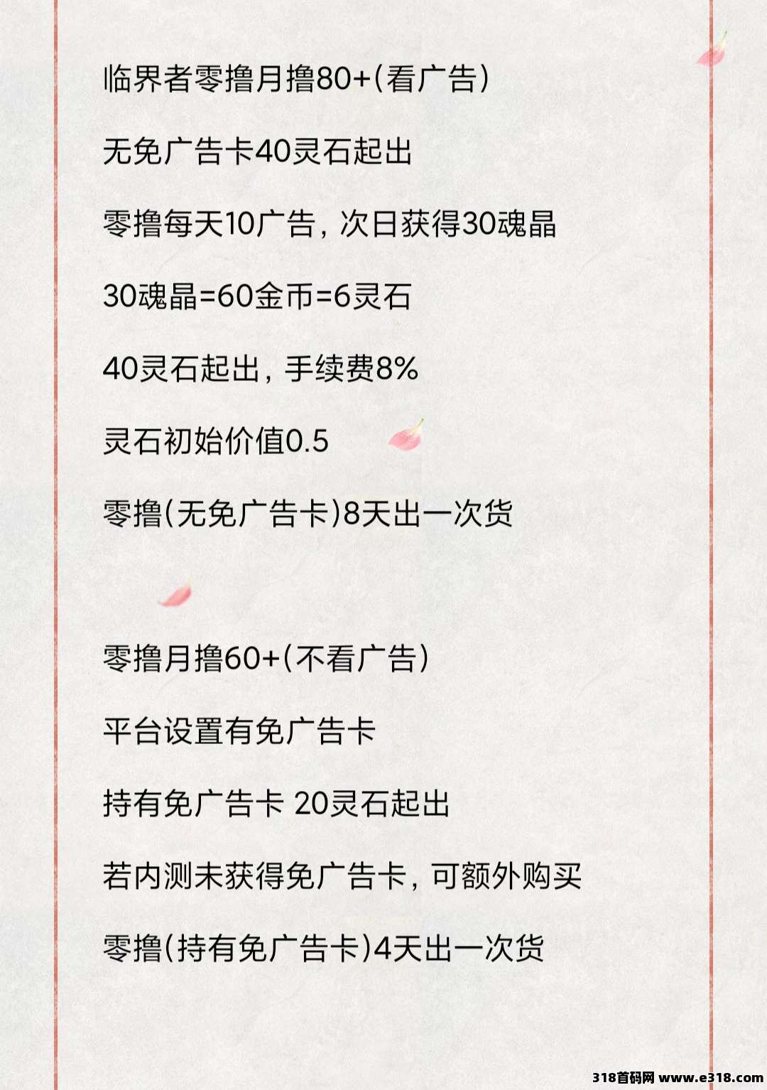 临界者每天零撸看广告获得30魂晶,锻造获得60金币,兑换6灵石价值3元