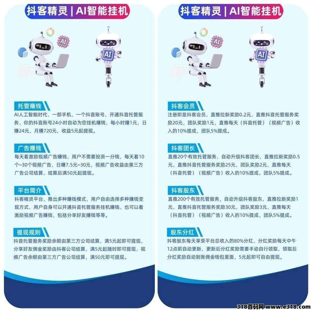 抖客精灵,零撸DY挂机平台,广告赚保底,不养机,拉新奖励,一个抖音账号,托管抖音服务,**挂机日赚24米,满5米起提现秒到账。