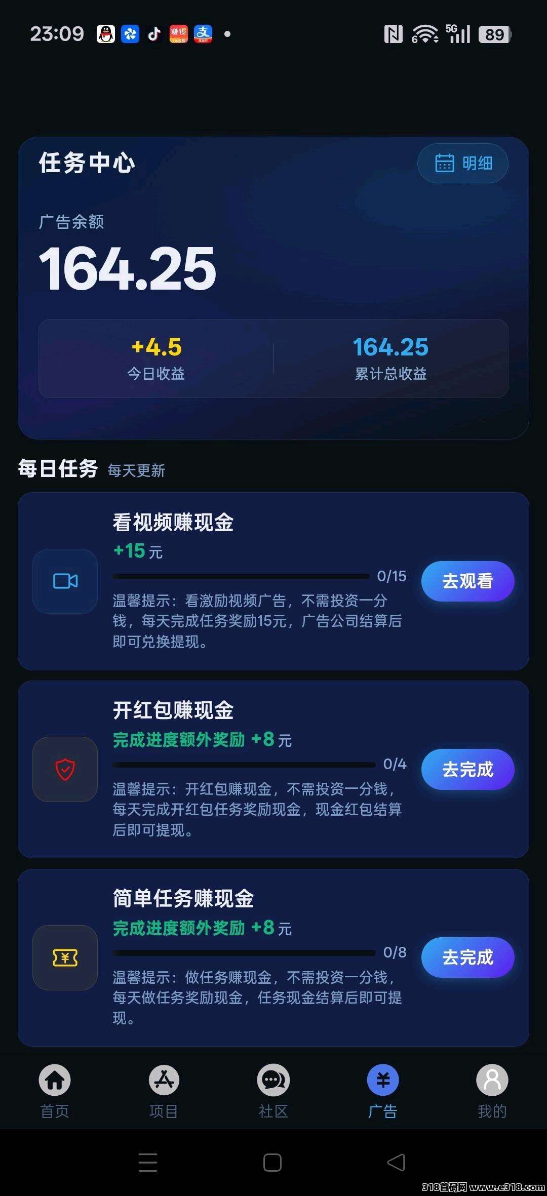 **赚钱②:看视频广告赚钱,每天看10个~30个广告,日赚7.5米