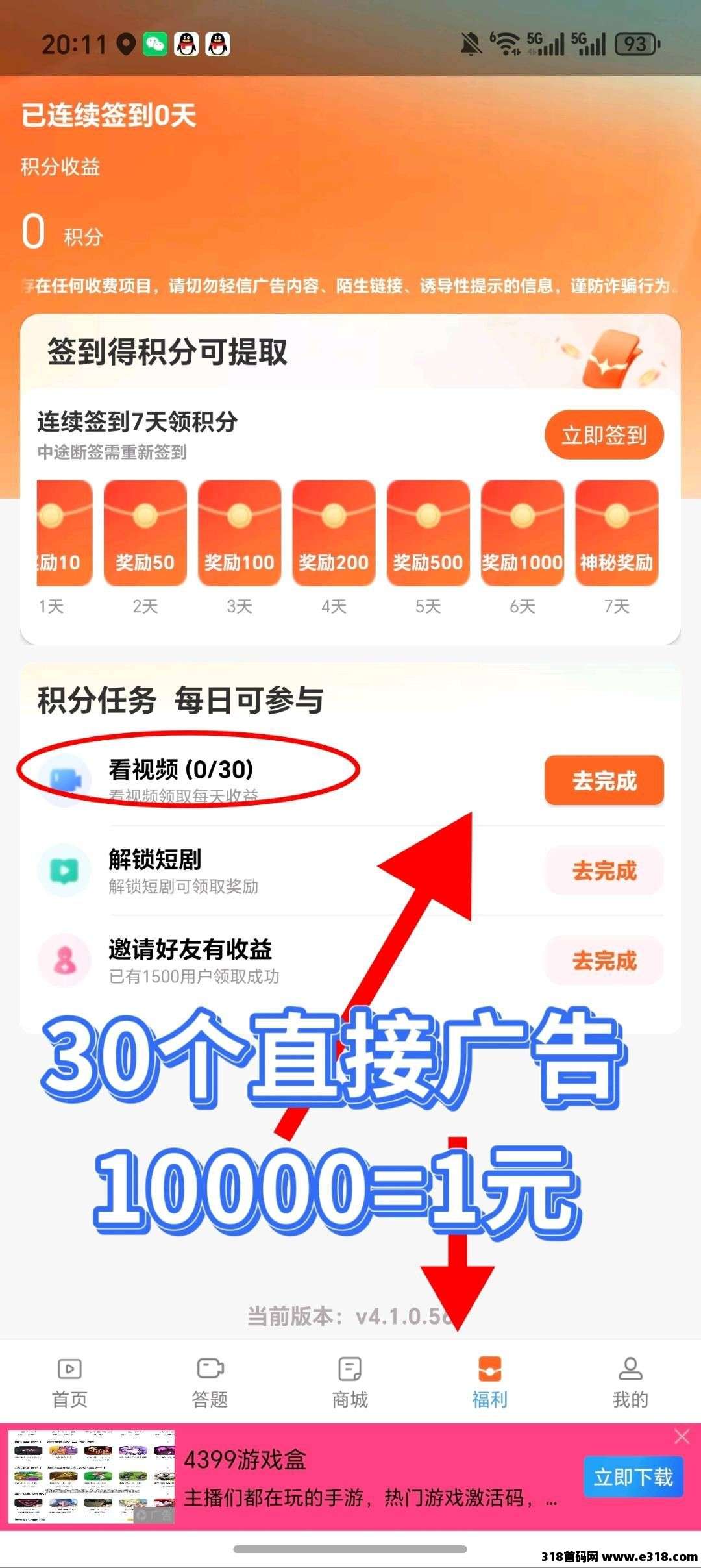 单价0.1-5米,1元起提现24小时内到账!这个是看视频APP,看视频0.1~5元。每天有签到视频广告,