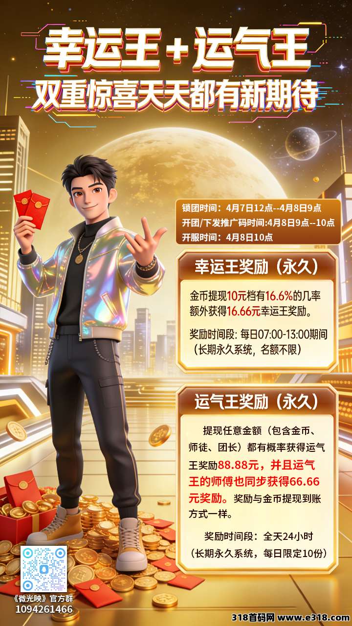 获得运气王的用户,额外奖励 88.88,其师傅同步获得 66.66 奖励。
