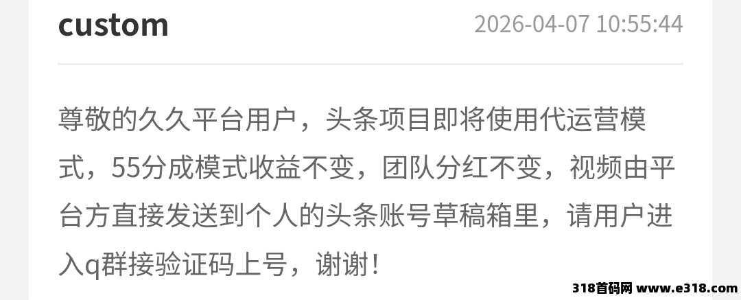 今日头条项目,你先拿收益后分成,合作模式,团队无线代平1级,今年最强零撸。