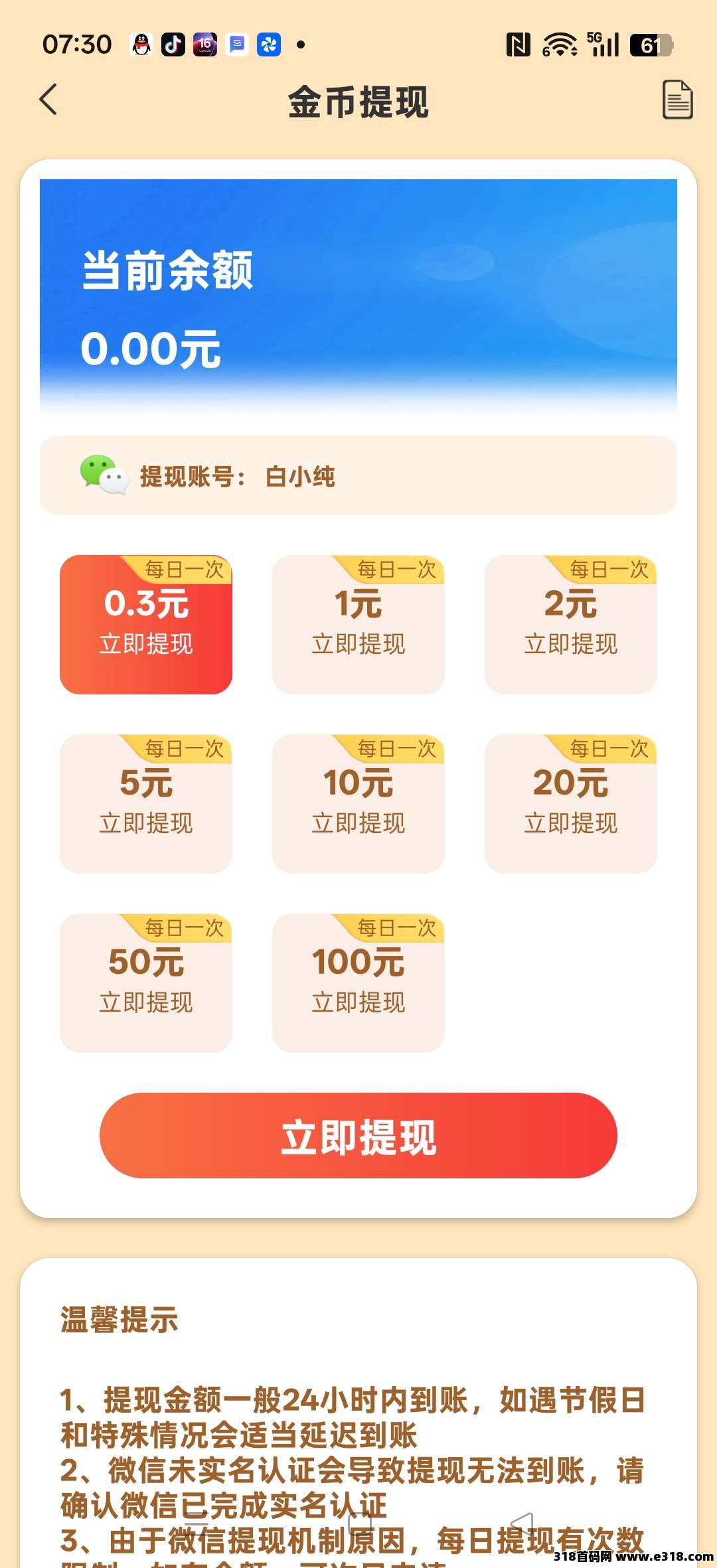 单价0.1-5米,1元起提现24小时内到账!这个是看视频APP,看视频0.1~5元。每天有签到视频广告,