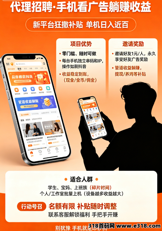 你是不是还在找简单靠谱的兼职?手机看广告收益项目,真正零门槛、随时可做!每台手机独立串码和IP,对接广告代码后,刷刷视频、点点互动,就能拿现金、金币、佣金——操作跟刷抖音一样简单,收益却稳定到账。
