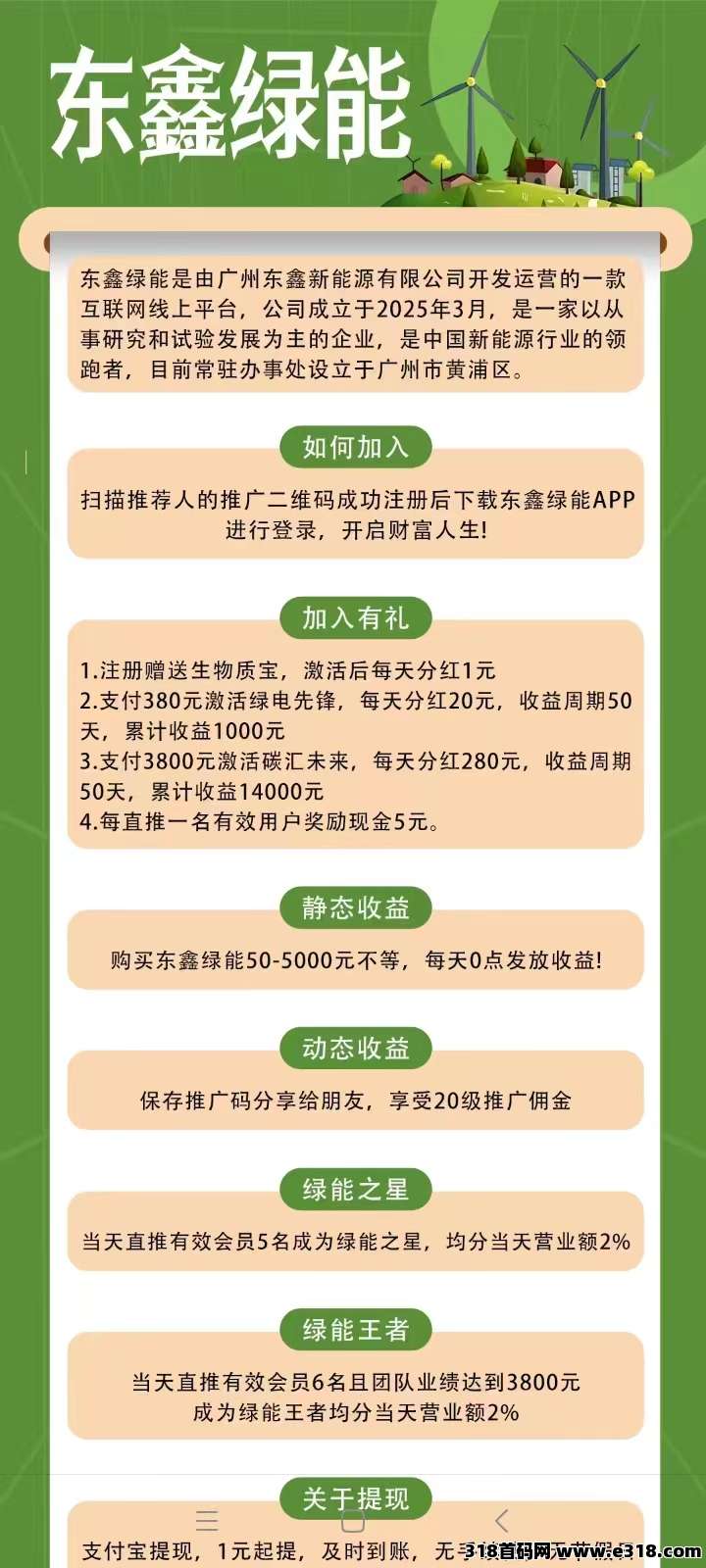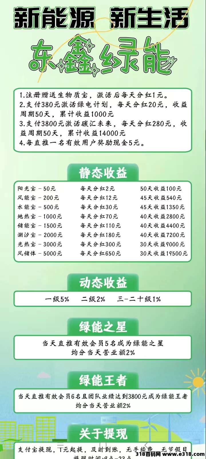 绿鑫绿能每天都是自动赚模式,零门槛加入绿电计划,每天最低收138元。所有收益满1元即可提现,无手续费,周转提现极快。。。