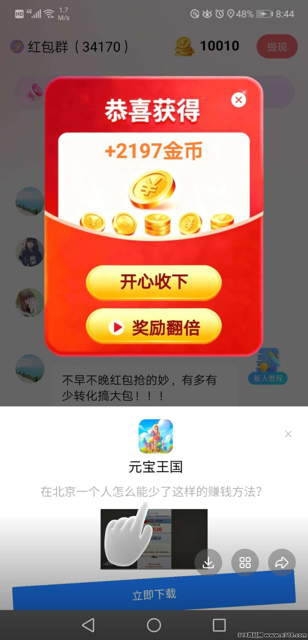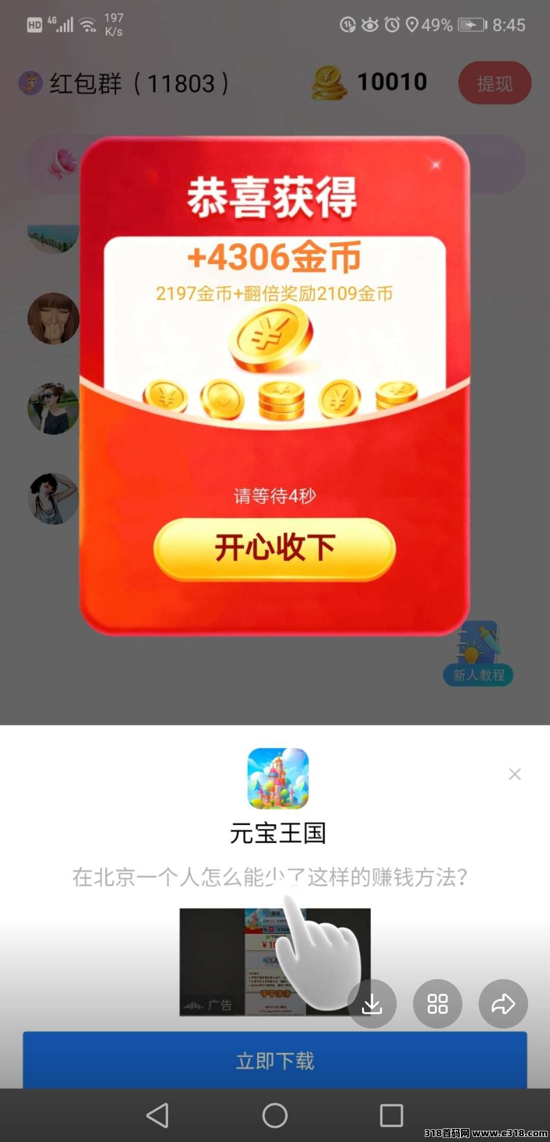 ps:红包出来先别急着领,隔开5个左右领一次,领的时候注意下面要弹出广告,这样金币会多些。