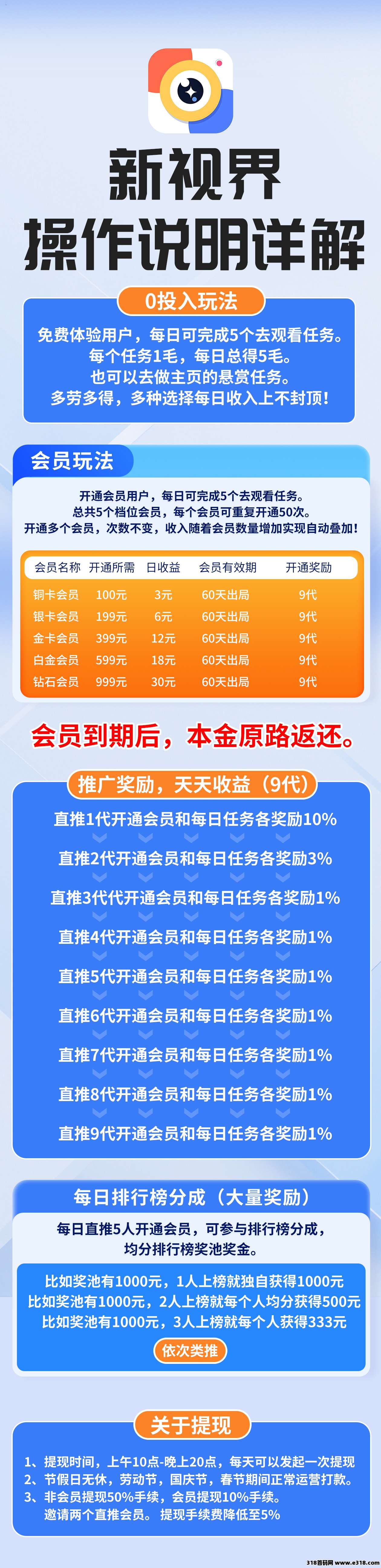 首码【新视界】火爆上线零撸每天去观看5个视频每个0.1元赚0.5元,亲测提现秒到100元❗️