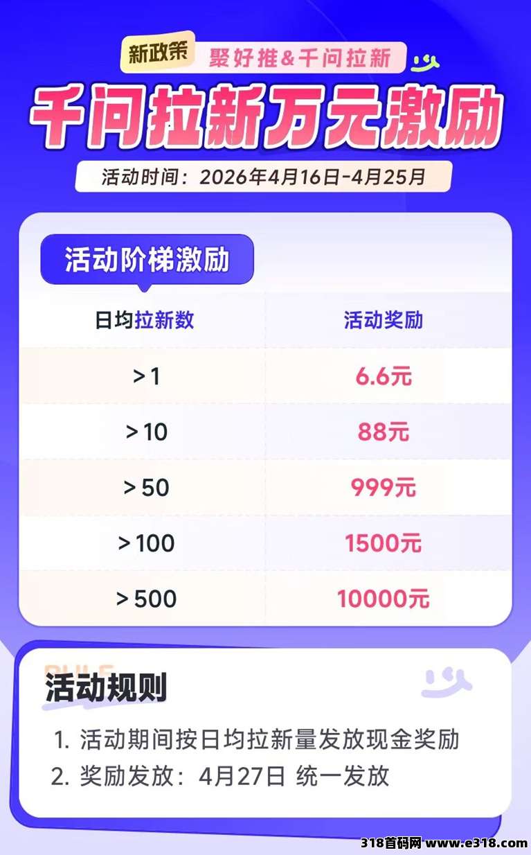 聚好推千问拉新火爆来袭,全网招募推广达人,佣金置顶收益日结,聚好推千问拉新狂飙!开启财富增长新征程,在当下竞争激烈的互联网推广领域。