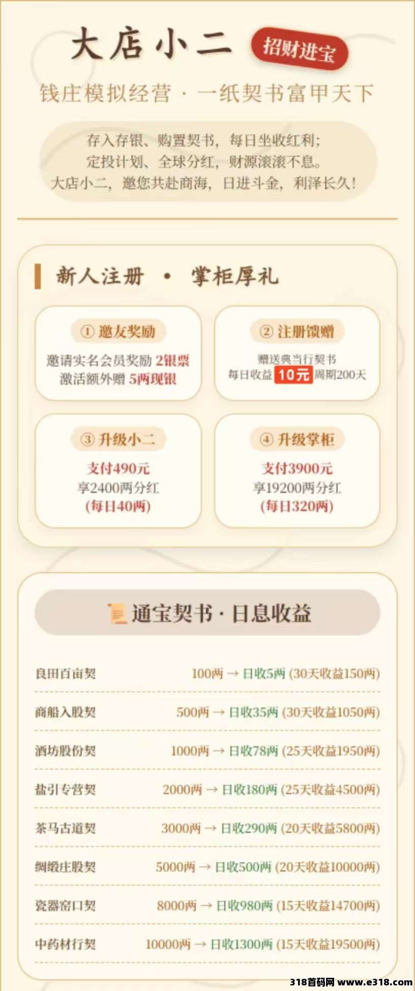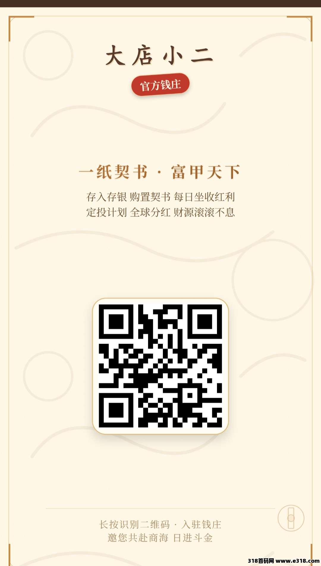 首码把握住机会 只要你努力 轻松入账几千 大店小二纸契书富甲天下 册馈赠产品每日收益 10元 周期200天 4月18号9:18上线