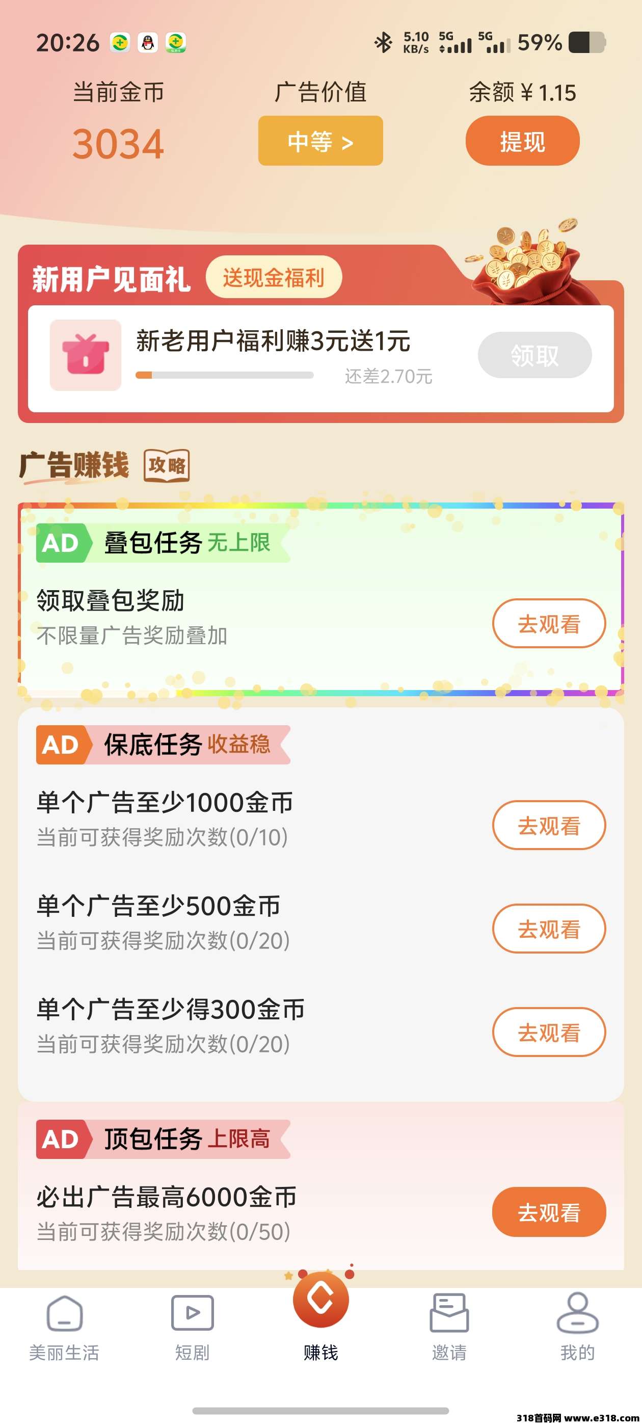 3、新增保底任务:观看对应收益广告就有对应保底收益;