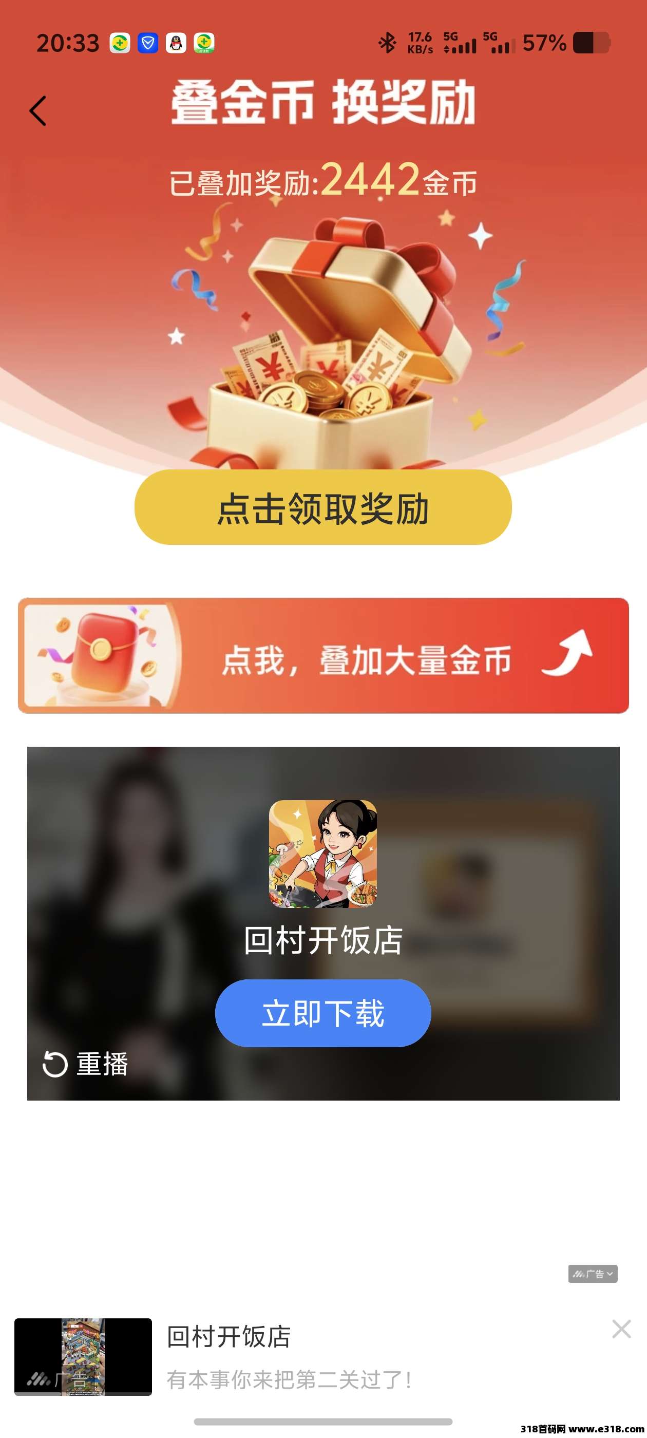 2、新增叠包任务:app内所有广告可叠加领取金币;