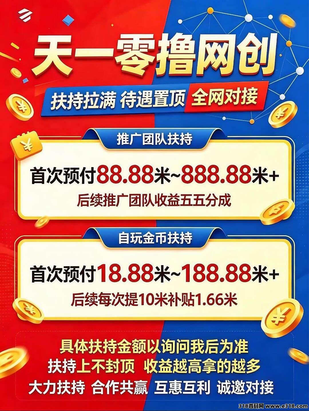 推广团队扶持 首次预付88.88米~888.88米+ 后续推广团队收益五五分成