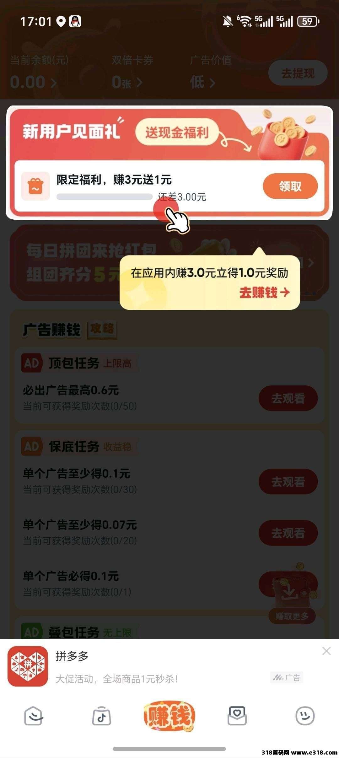 1.保底看广告0.1*30个=3元
