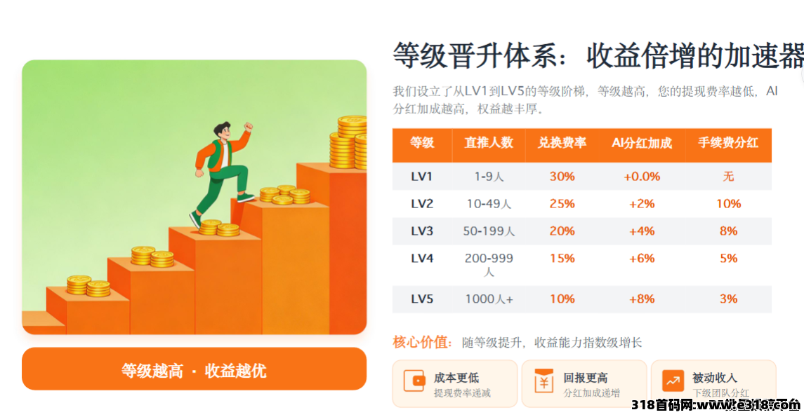 综合等级、粉丝量、活跃度、能量值精准计算权重每日盈利自动分配、多劳多得、实时到账团队越大、权重越高、收益越高,被动躺赚天花板!