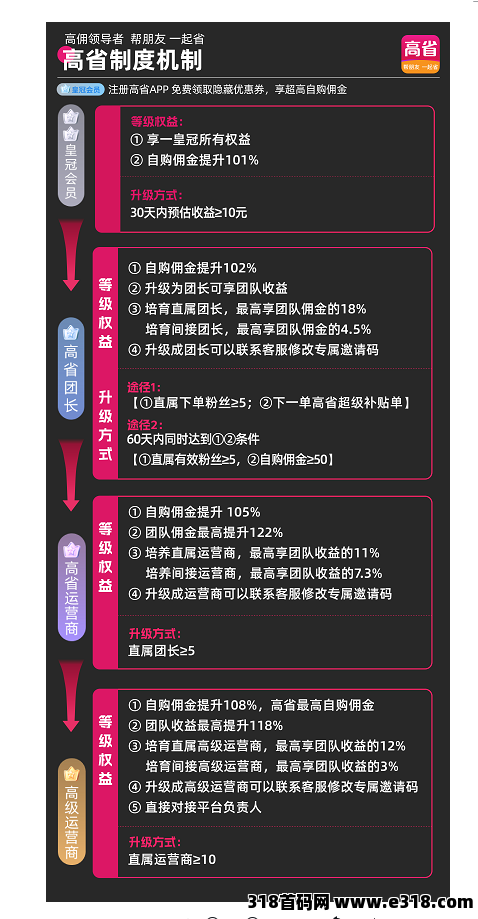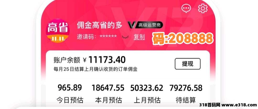 高省邀请码:208888。新用户注册高省APP时填写此码,可直升双皇冠会员,跳过新手期直接享受101%自购佣金比例。本文从平台资质、CPS底层逻辑、等级收益体系及本地生活场景四个维度,客观拆解高省项目的运行机制与实操路径。