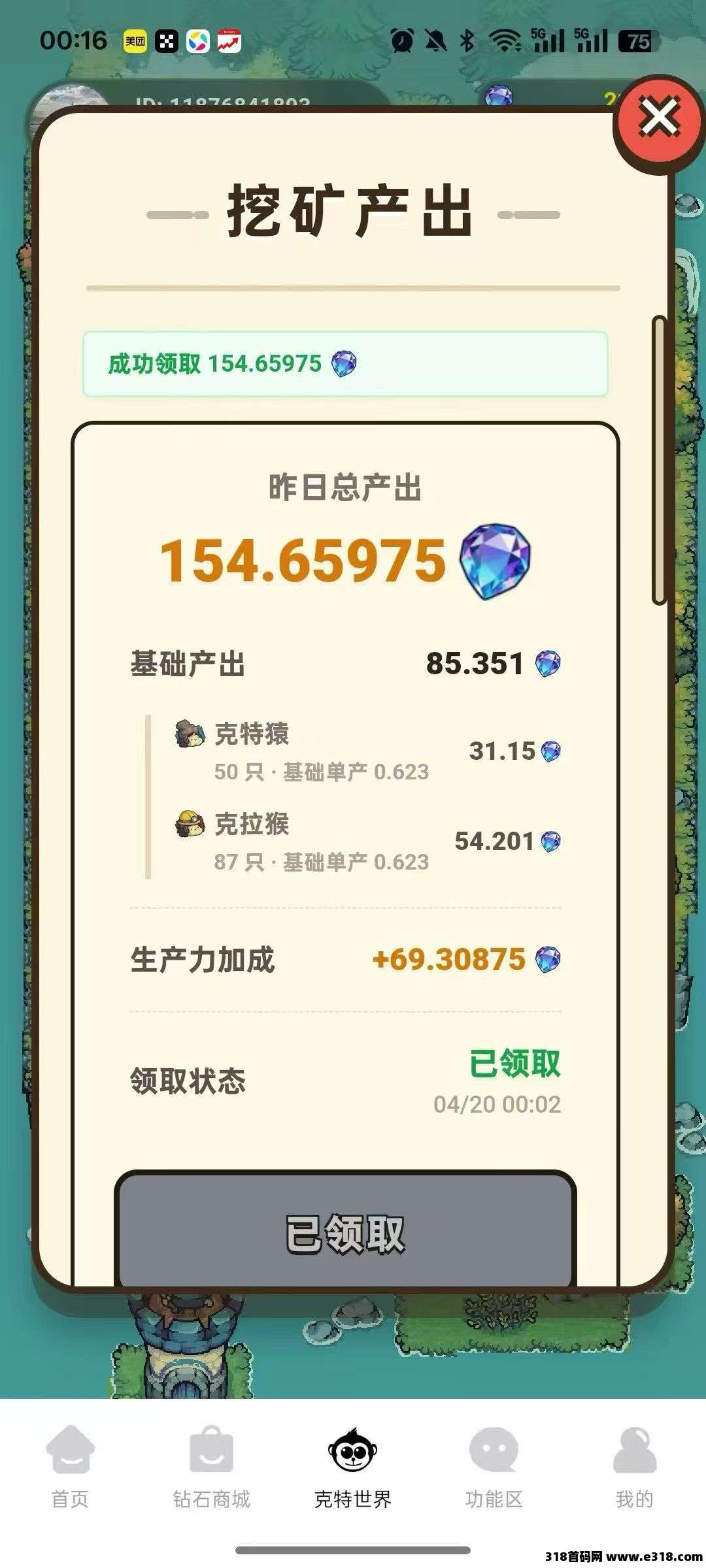 克特小世界收零撸新用户,可零撸可投资,零撸不看广告,一个月30+,看广告一个月70+,每天保底0.623宝钻石,满1钻石出,每天都在涨,邀请码:D9E7FB78.