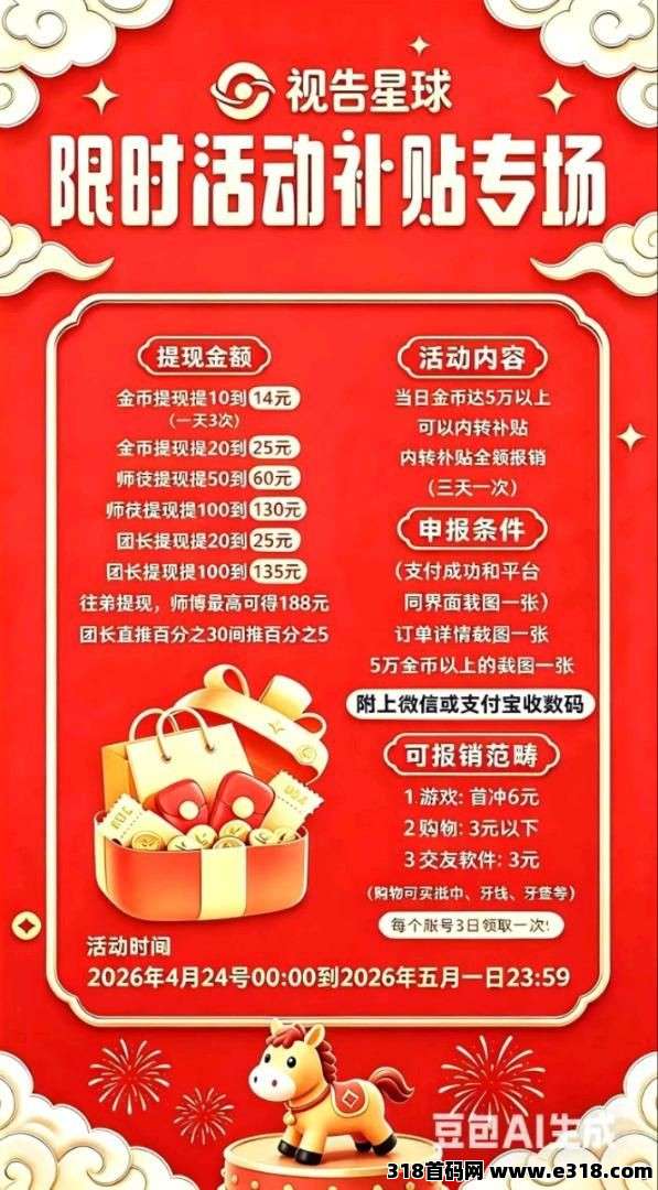【视告星球】首码,零撸广告赚,保底收益高,放水中,团队模式,撸包看广告。邀请几十米,满1元起提