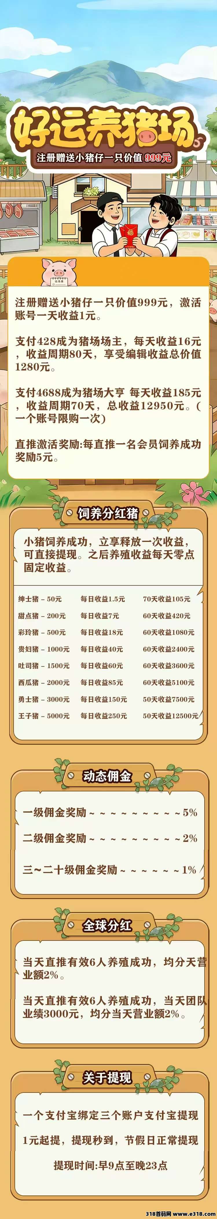 首码预热内排好运养猪场4月23号上线送999元,全新模式每天0点收益,每天可提现收益,本金自由到期可退!注册激活有扶持