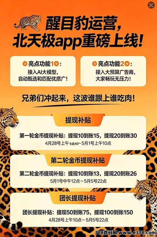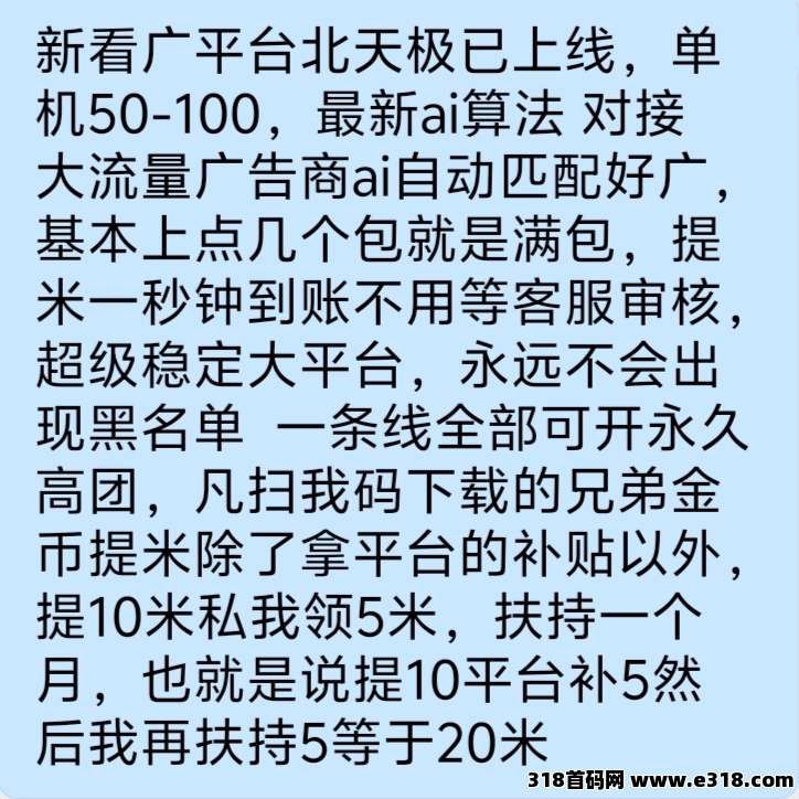 新看广平台北天极已上线,单机50-100,最新ai算法 对接大流量广告商ai自动匹配好广,基本上点几个包就是满包,提米一秒钟到账不用等客服审核,超级稳定大平台,永远不会出现黑名单 一条线全部可开永久高团,凡扫我码下载的兄弟金币提米除了拿平台的补贴以外,提10米私我领5米,扶持一个月,也就是说提10平台补5然后我再扶持5等于20米