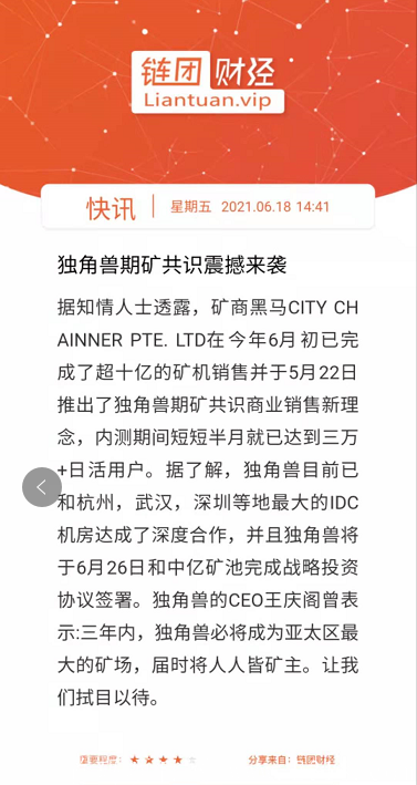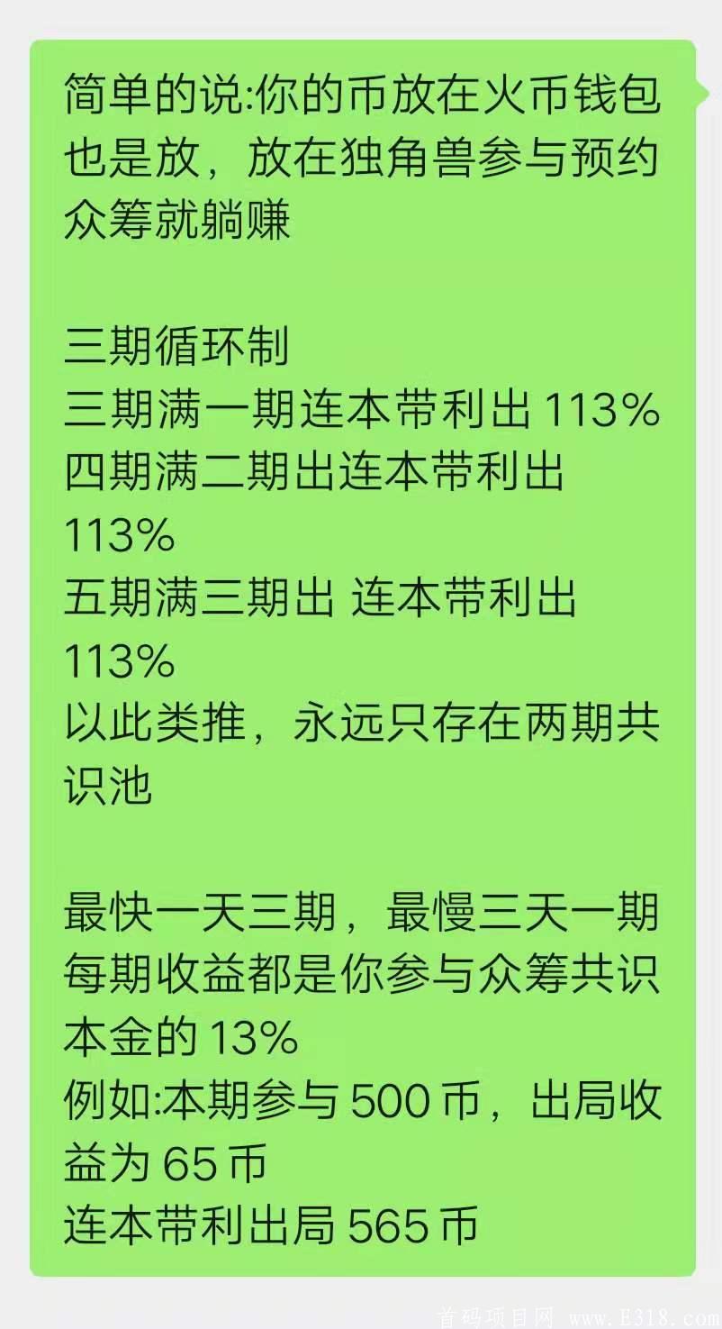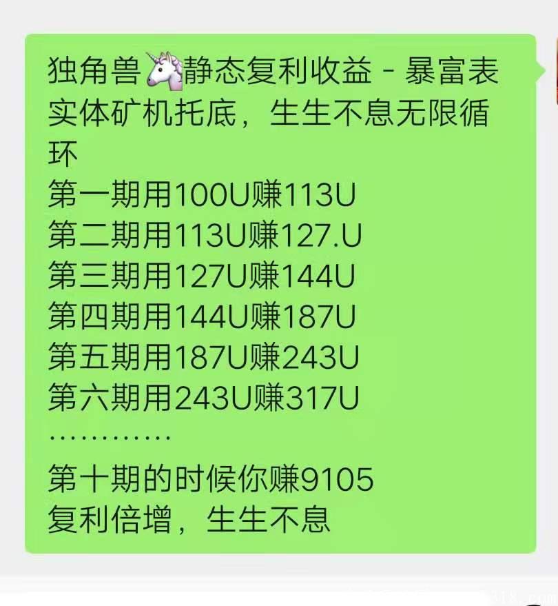 说简单点:如果你手里本就有***,原本你都是放在火币或者是钱包对不对,火币和钱包就是一个放币的地方,产生不了一分钱价值,现在只要你把币换个地方放在独角兽就会自动参与共识众筹,3-6天就能产生13%的**收益,完美的创新模式,彻底解决了常规项目无法消除泡沫导致项目不能长久运行的弊端,成功打造出一套生生不息无限循环多方共赢的商业模式,颠覆币圈项目圈传统模式,一场趋势革命必将火爆全网!没有繁琐的操作,没玩过币的币圈小白都能躺赚!就是这么简单!