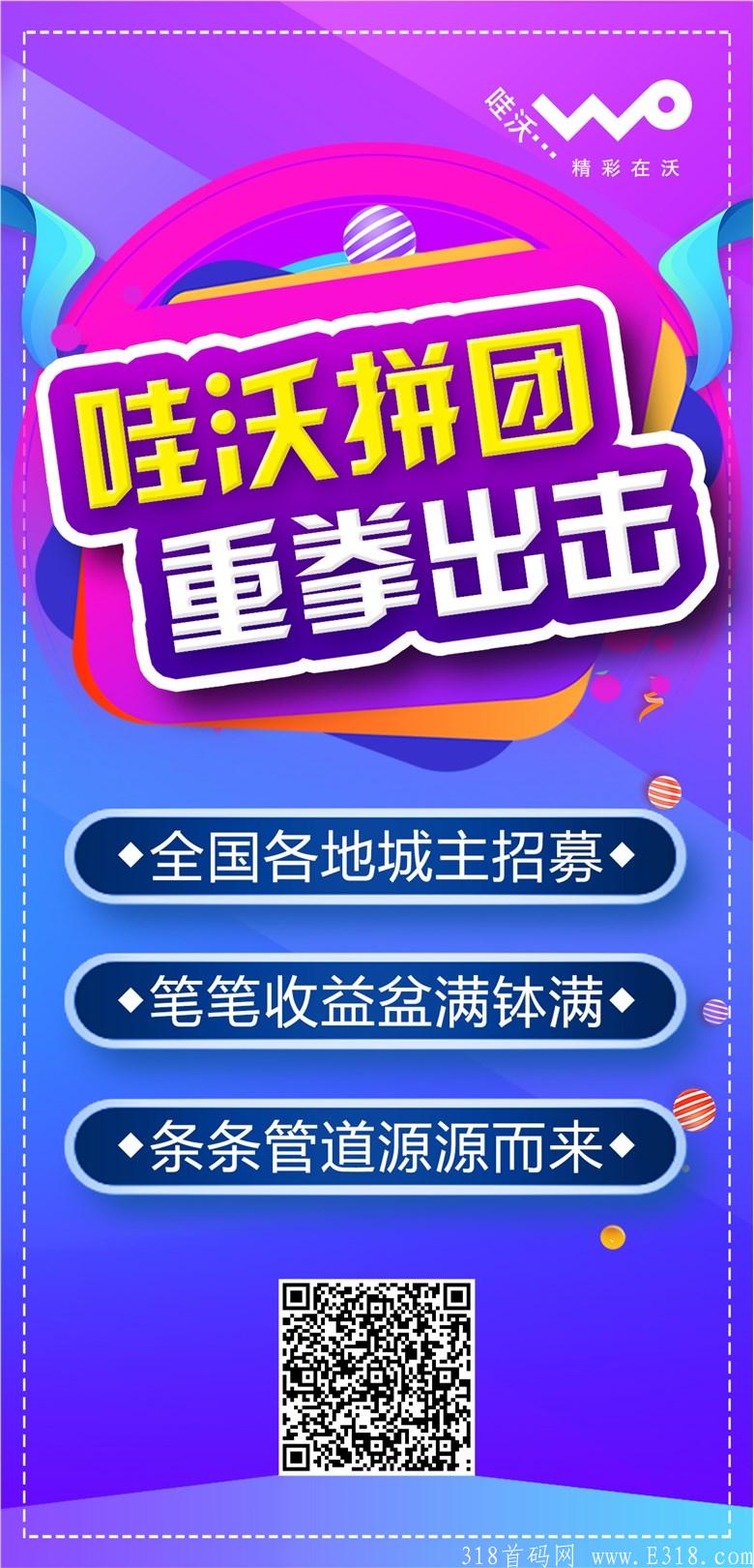 联通哇沃拼团是中国联通旗下一级渠道代理商精彩在沃网络通信公司的一个板块,成立于2020年一直做联通线上业务,全国百余家落地营业厅,几十家运营中心,整个系统都在联通网络APP里,拼团只是APP中的一个版块,用来快速吸粉打通实体落地和网上联通业务以及拼团商城的闭环,后期还会有支付业务以及自营商城C2M模式。
